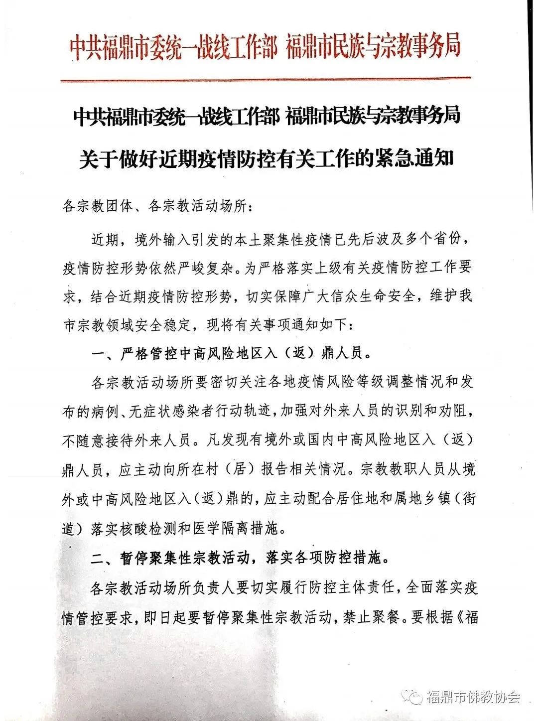 福鼎市关于做好近期疫情防控工作的通知 编辑:泷中 • 2021年8月4日 上午9:27 • 资讯 来源:福鼎市佛教协会 2021-08-03 通 知 全市各寺院: 接市委统战部、民宗局通知,全国多地疫情严重,全市各寺院应全面加强疫情防控管理,实现防控不松懈、疫情不出现、保障信教群众生命安全和身体健康。根据文件精神,积极做到“非必要不外出、非必要不离鼎”,尤其不要前往中高风险地区以及存在新冠肺炎疫情的地区。外出时严格做好自身防护,及时报告活动轨迹及身体健康状况,并在返(来)鼎后严格落实我市疫情防控相关措施。 即日起,进入场所的人员须测温、登记、戴口罩、持绿码,强化个人防护意识、勤洗手、 不举行大规模集会和法会。 关于疫情防控工作通知(一) 关于疫情防控工作通知(二) 本网站属于非赢利性网站,转载的文章遵循原作者的版权声明,如有版权异议,请联系值班编辑予以删除。 联系方式:0591-83056739-818 18950442781 赞 (0) 编辑:泷中 0 0 生成海报 黄梅芦花庵暂停对外开放的通知 上一篇 2021年8月3日 下午5:12 温州佛教界捐款捐物驰援河南 下一篇 2021年8月4日 下午1:47 相关推荐 资讯 2024年全国佛教院校联席会在北京举行 000 三三两两 2024年9月3日 资讯 “十方佛”都是哪些佛?你能说出几个? 000 编辑 志斌 2022年11月2日 资讯 立足“三学” 厚植爱国情怀——湖北省佛教界深入学习宣传《中华人民共和国爱国主义教育法》 000 三三两两 2024年1月25日 资讯 北京香云连首尔,和平愿海遍三千——韩国佛教宗团协议会代表团拜访中国佛教协会 000 三三两两 2024年8月30日 资讯 2022广东佛教讲经交流会在河源举行 首邀港澳地区法师示范讲经 000 编辑 志斌 2023年2月24日 资讯 撞毁的车与未碎的愿:慧礼法师的非洲弘法生死劫 000 编辑:庄雅婷 2025年6月28日 资讯 梦参长老:定业是可以转的,为什么你转不动 ? 000 编辑:庄雅婷 2024年2月26日 资讯 丽水市第十届汉传佛教讲经交流会在缙云南宫禅寺圆满举办 000 smy 2023年5月30日 资讯 中国新闻网:星云法师少林纪行:“功夫是用来行道的” 100 编辑 志斌 2023年2月8日 资讯 福鼎市佛教协会召开2021年第一次理事会议在金竺寺召开 200 编辑:泷中 2021年7月13日 发表回复 您的邮箱地址不会被公开。 必填项已用 * 标注*昵称: *邮箱: 网址: 记住昵称、邮箱和网址,下次评论免输入 提交