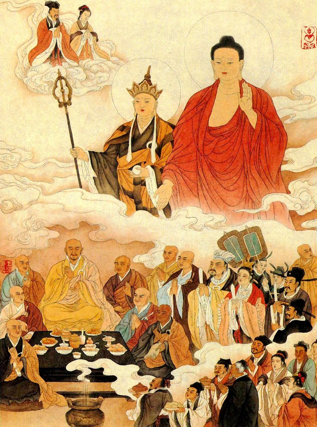 佛欢喜日是我国传统的盂兰盆节。据《盂兰盆经》中记载:佛陀的大弟子目连尊者,得六通后,即以道眼看到已经去逝的母亲堕入地狱饿鬼中受苦,瘦得皮包骨。他很难过,亲自下到地狱要救母亲,但由于业力的关系,始终不能改变,只好回来向佛陀求救。佛陀说你有孝心是很好的,但是善恶自有果报,不能随便了结。唯有广行一切善业,在七月十五这天,众僧结夏安居修行圆满的日子,凭借其他出家人修行的功德,对众忏悔,方能使自己七世父母脱离三途,得以解脱。