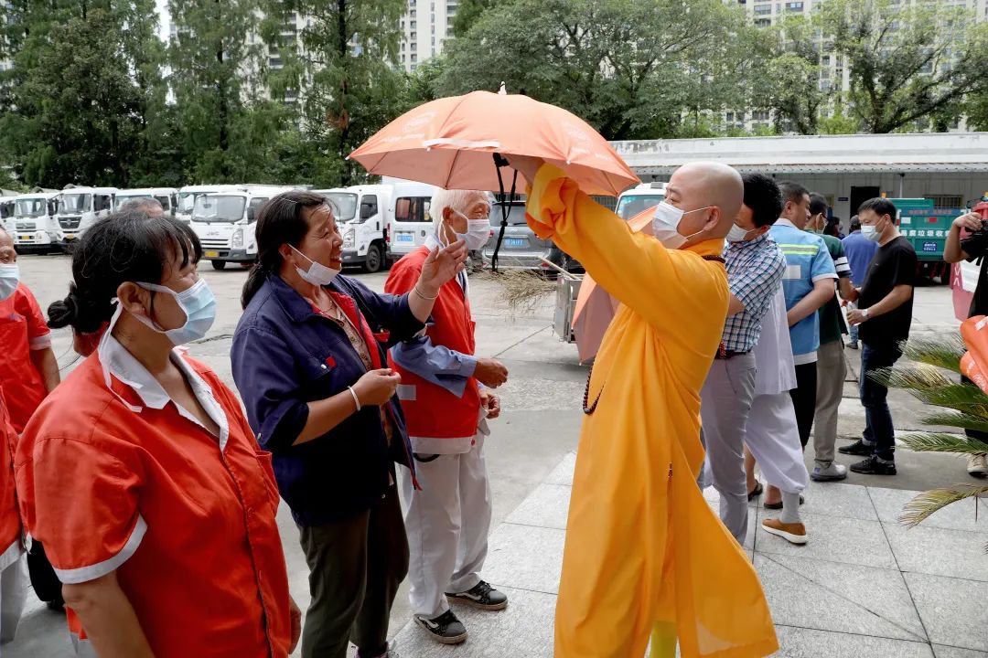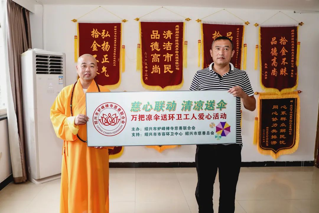 8月13日,绍兴炉峰禅寺慈联会“慈心联动•清凉送伞”万把凉伞送环卫工人活动在绍兴市环运废弃物处置有限公司举行。