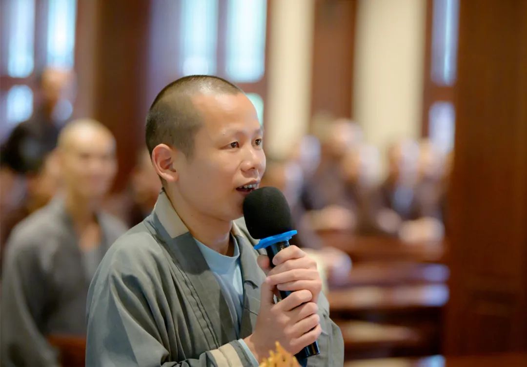 接下来是教务长宗贤法师发言,法师首先强调说:“大家学法要如法,不然‘法’是很难学到家、很难入心的。”他勉励大家利用放假时间好好总结一下,对已学内容查漏补缺。并且劝诫大家:心要安住,外面的世界很精彩,外面的世界也充满了诱惑。学法的心态不能急躁,可能学一段时间反而问题更多了,而这恰恰是一种收获,能发现问题就是最好的收获。世间讲求效率,但是学佛不能讲求效率,心要沉静下来,慢下来,学法是一个漫长的过程。