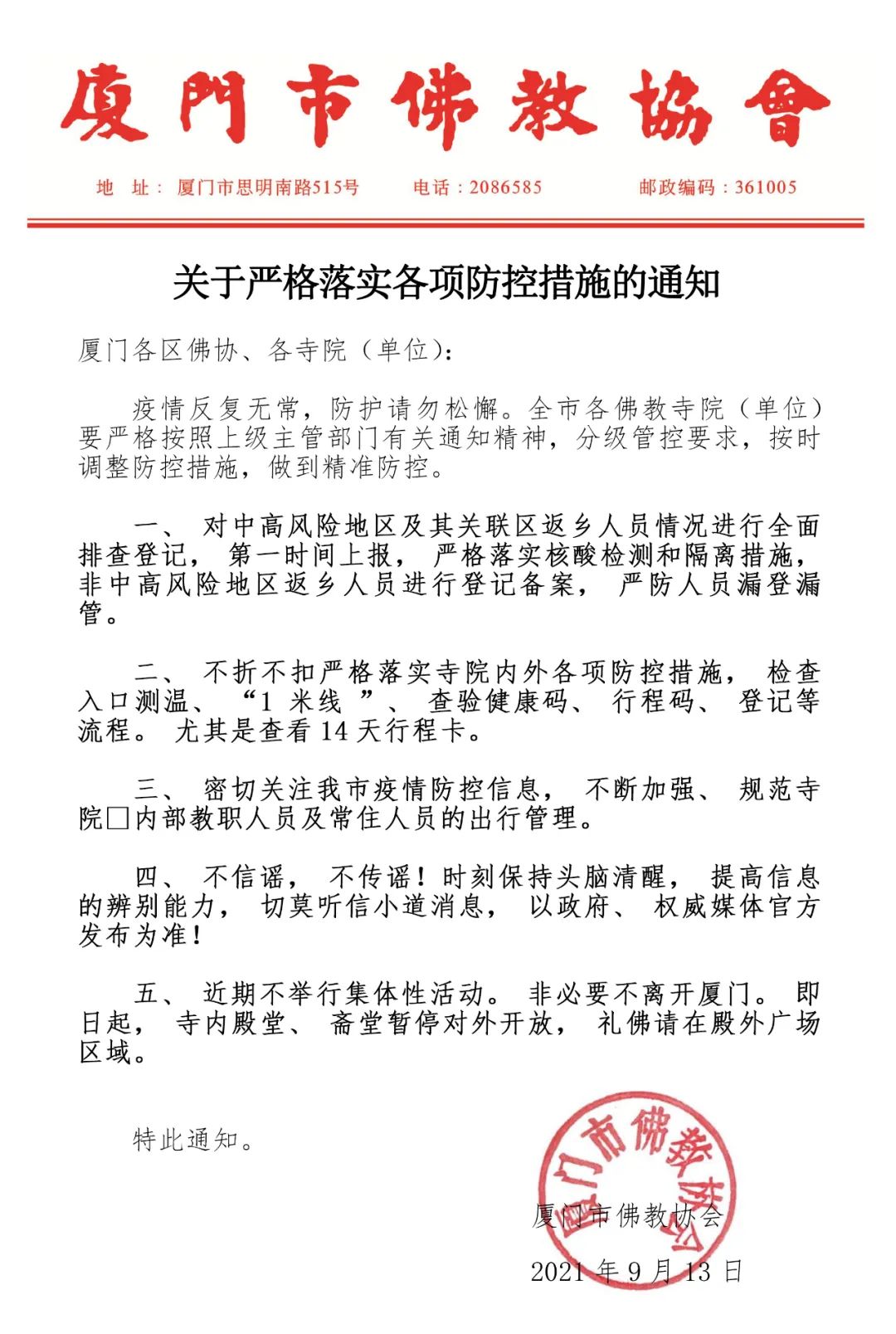 五、近期不举行集体性活动。非必要不离开厦门。即日起,寺内殿堂、斋堂暂停对外开放,礼佛请在殿外广场区域。