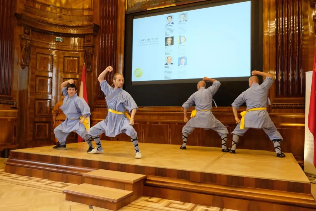 招待会上,奥地利少林文化中心的学员们展示了少林集体拳、少林刀等少林拳术与器械,得到在场嘉宾的阵阵喝彩与掌声。奥地利军乐队、维也纳华人爱乐合唱团等团体也表演了充满中奥特色的精彩节目。