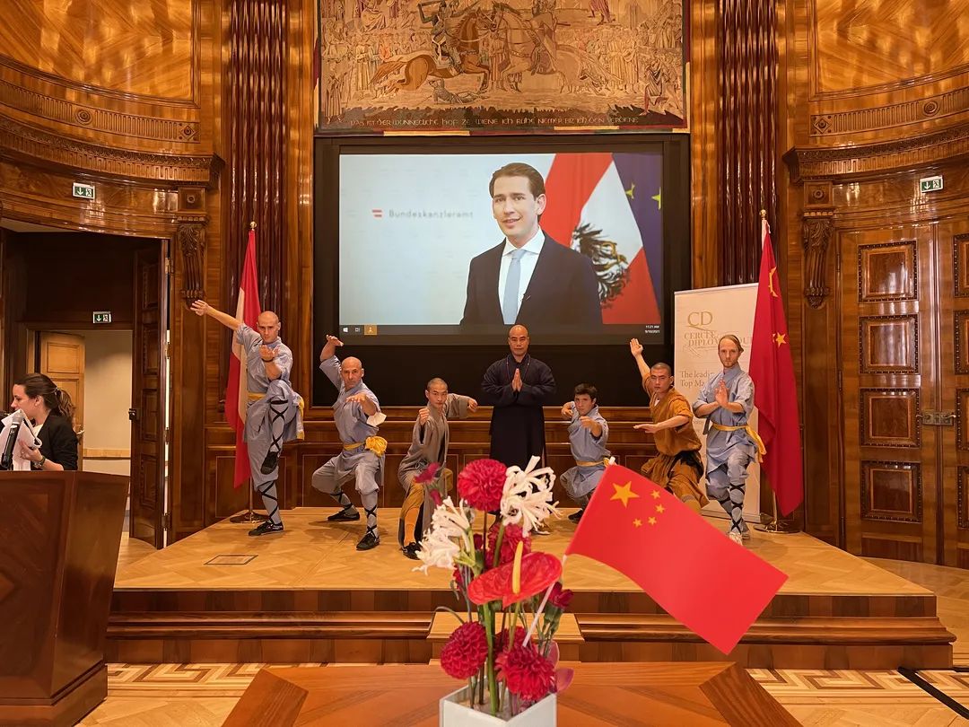2021年9月10日,中奥建交50周年、奥中友协成立50周年、《外交圈》杂志创刊50周年招待会在奥地利维也纳柏悦酒店(Park Hyatt Vienna)隆重举行。奥地利少林文化中心在负责人释延良法师的带领下,应邀参加招待会活动,并为现场嘉宾带来一场精彩的少林功夫展演。出席招待会活动的有:中国驻奥地利大使李晓驷,奥地利前总统、奥中友协主席菲舍尔,奥地利前副总理施宾德艾格,奥地利前国防部长法瑟阿本德,30余国驻奥使节,奥中友协常务副主席卡明斯基夫妇,《外交圈》杂志主编菲尔维格、布尔斯基,中国驻奥公使衔参赞杨文旭、文化参赞陈平,华侨华人及中资企业代表等百余位嘉宾。招待会上,奥地利总理库尔茨专门发来视频贺辞。