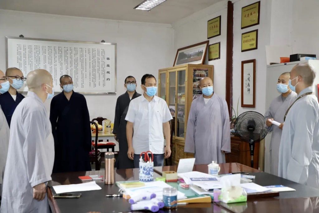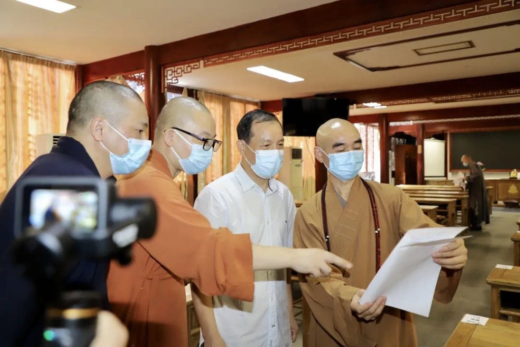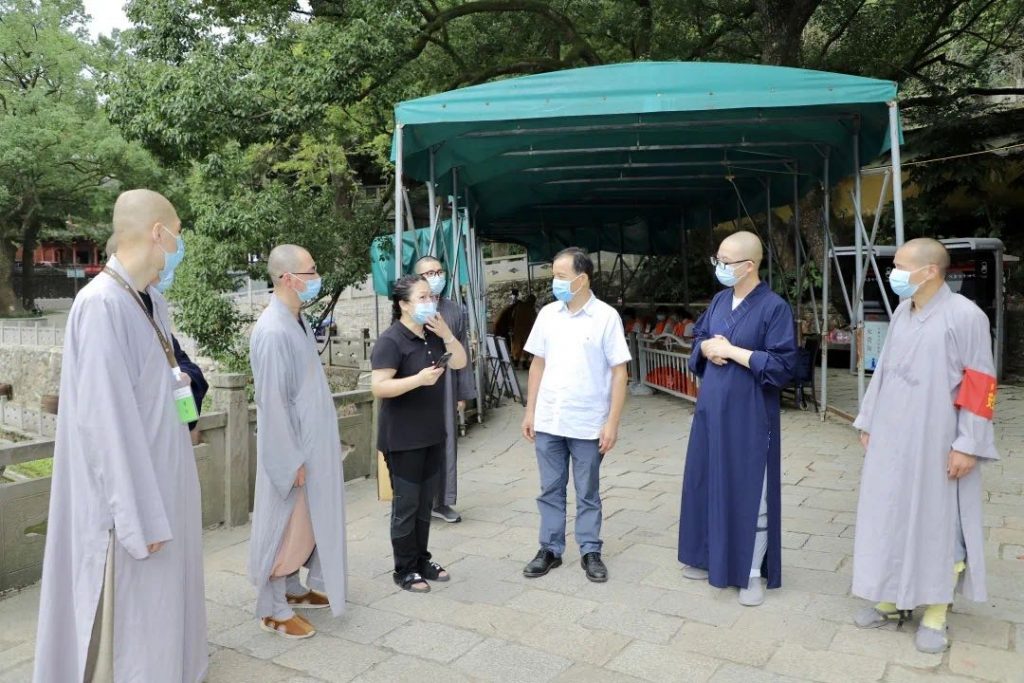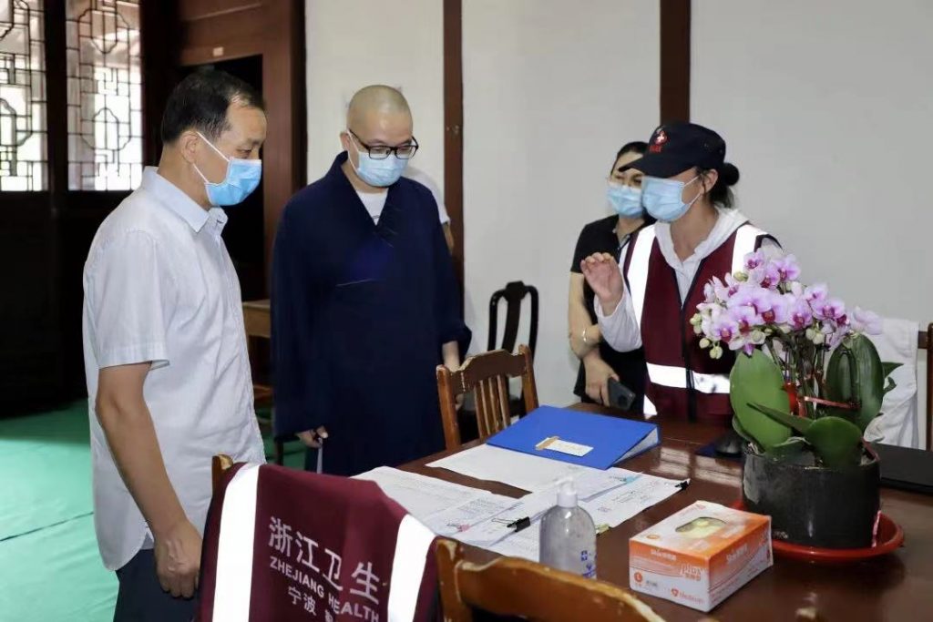 在天童禅寺住持诚信法师、慈云庵监院显德法师及戒场各传戒工作小组的陪同下,省佛协一行察看了戒子报到处、戒子生活区、传戒殿堂等场所,并重点检查了寺院的疫情防控及应急处置工作。