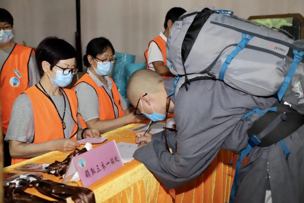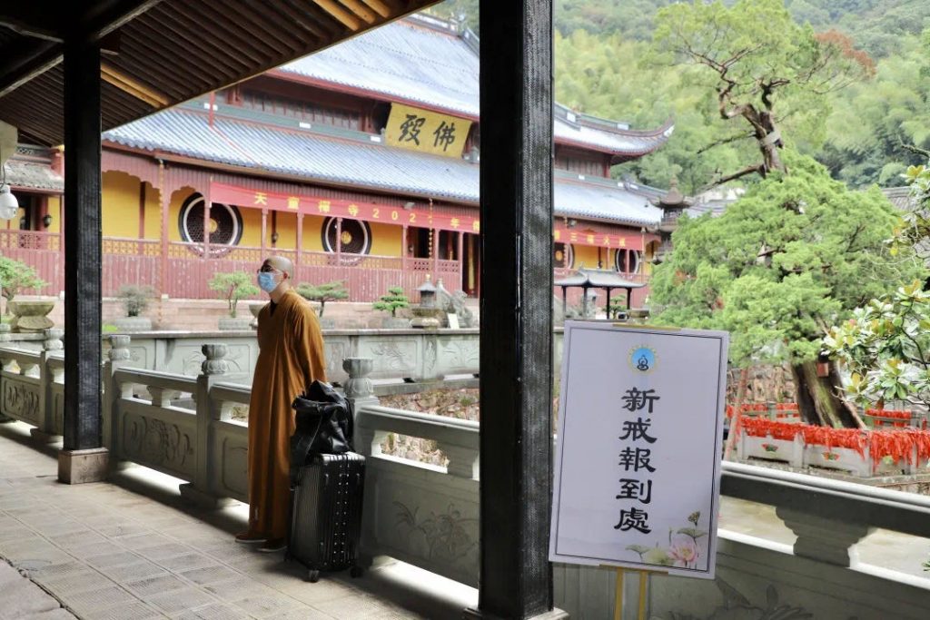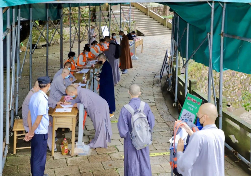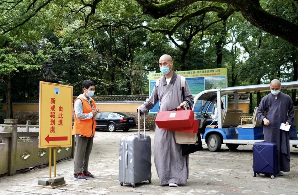 报到期间,戒子们按每人预定报到时间到达戒场山门,依次登记个人健康信息,接受体温检测、行程码检查,提交健康码及核酸检测报告;接受戒场功课考核并将通讯工具及个人贵重物品寄存到常住,领取戒期所需的衣、钵、具等物品,欢喜入单。从报到现场来看,天童禅寺和慈云庵的报到工作流程严谨、把控严格、秩序井然。