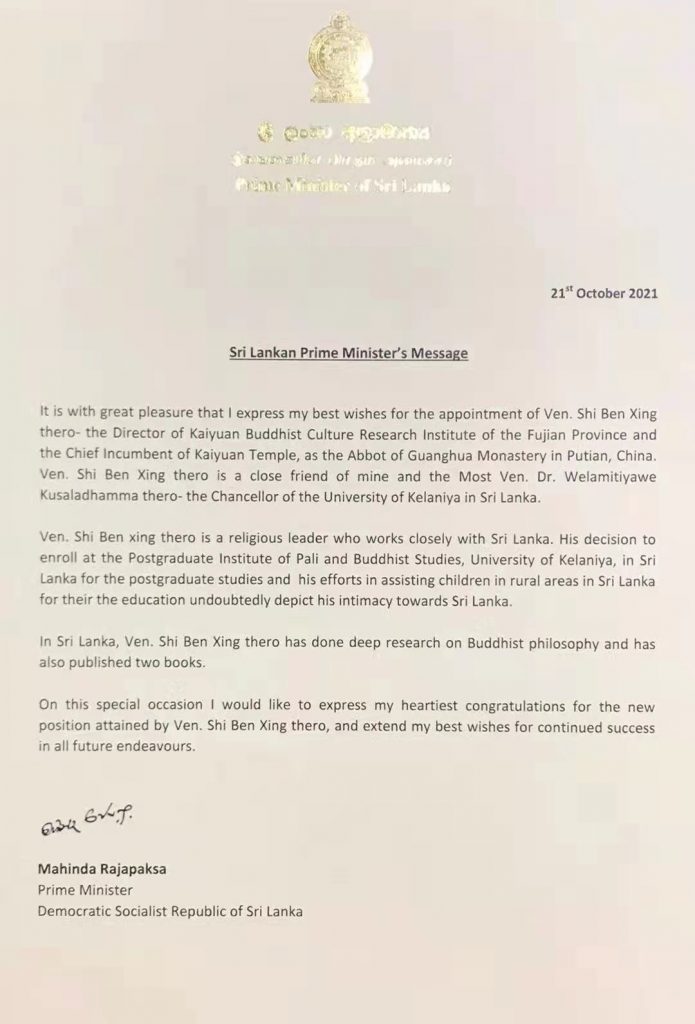 斯里兰卡总理马欣达•拉贾帕克萨先生在祝贺函中说:“尊敬的本性法师是我本人和斯里兰卡国立凯拉尼亚大学校长维拉米提亚维·善法大长老的一位非常亲近的朋友。本性法师是一位在弘扬佛法上与斯里兰卡密切合作的宗教导师。他进入斯里兰卡国立凯拉尼亚大学校长所属巴利文和佛学研究所深造的决心和他努力帮助斯里兰卡欠发达地区儿童教育的付出无容置疑地描绘出了他对斯里兰卡的友善之心。在斯里兰卡,本性法师对佛教哲学进行了很深的研究并在斯里兰卡出版了两本关于佛教在生活中运用的书籍。”