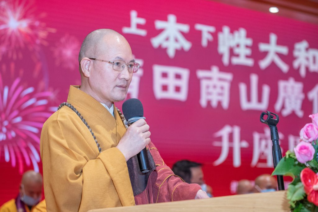 惭愧本性,今日,有幸入此山门,住持南山,为广化寺守护山门,传承南山风范。为此,吾很感念诸佛菩萨的护佑,历代祖师大德的加持,亦感恩诸缘和合,善缘成就,尤其是各位党政领导、诸山长老、贵宾朋友、法师信众的信任、关爱、支持、指导 , 特别是寺院常住僧俗与学院师生的共襄盛举。