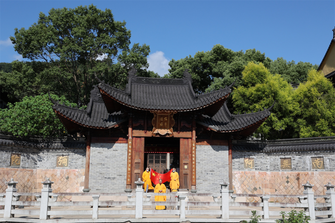 2022年10月1日上午九时,永嘉祖庭头陀寺全体僧众,于山门广场隆重举行庆祝“中华人民共和国成立73周年”升国旗仪式,以庄严神圣的形式表达对伟大祖国的崇敬和热爱之情。