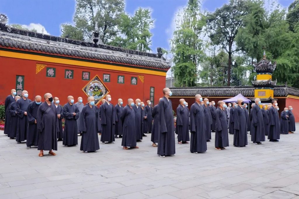 升旗仪式现场,气氛庄严,全体僧众,着装统一,站立整齐。