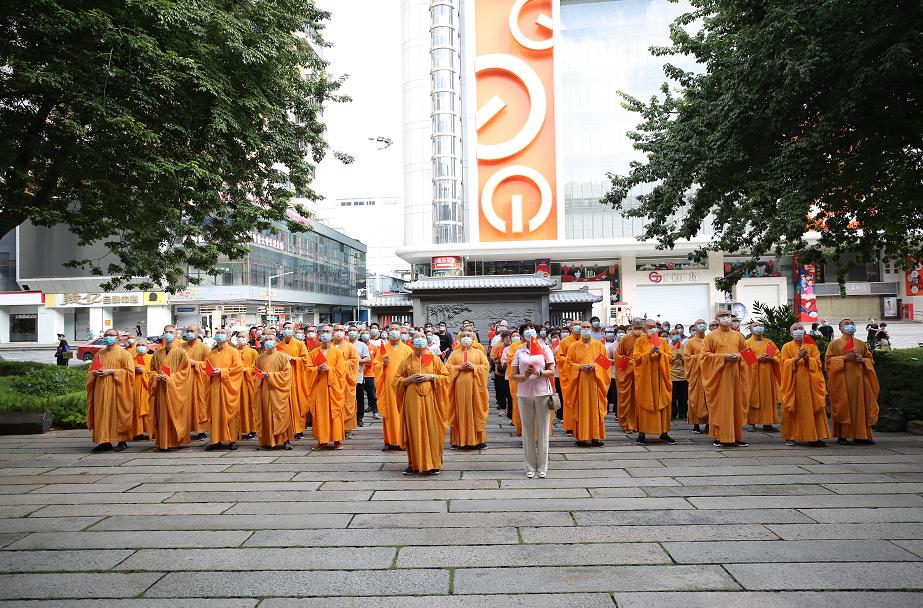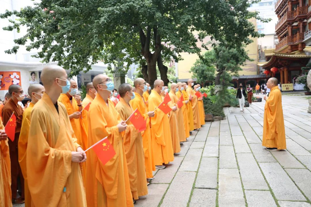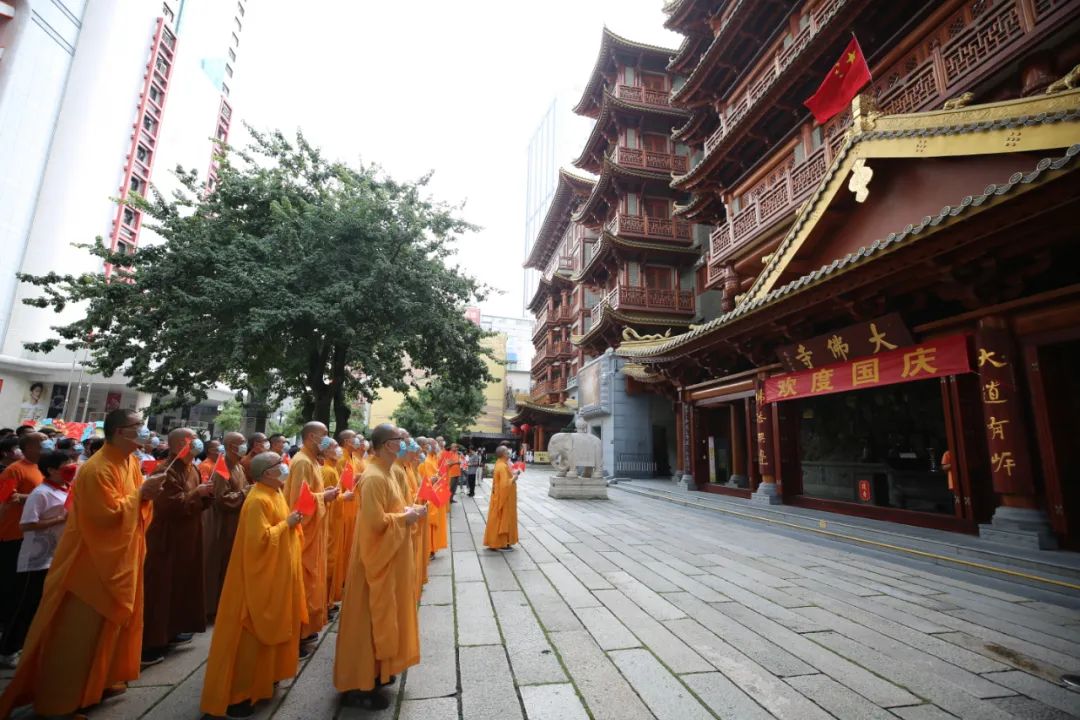 国庆节的北京路步行街上阳光明媚,大佛寺北广场古柏苍翠、繁花似锦,弘法大楼上,五星红旗正迎风飘扬。广州市大佛寺住持耀智大和尚带领大佛寺两序大众及职工、义工、信教群众等手握国旗,共同参加仪式。在雄壮昂扬的国歌声中,大众对着飘扬的五星红旗,集体行注目礼,献上对祖国最美好的祝福。共同祈愿祖国繁荣昌盛、社会和谐安定、人民幸福吉祥,祈愿世界和平、人类命运共同体团结进步。