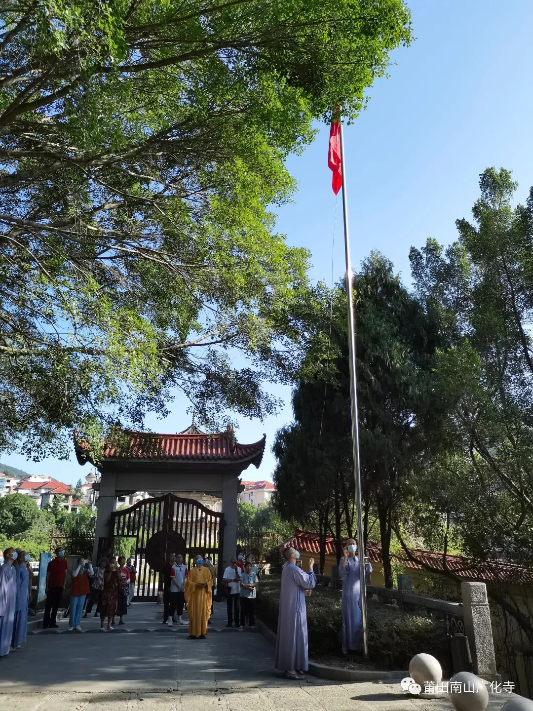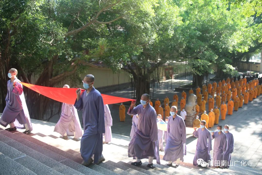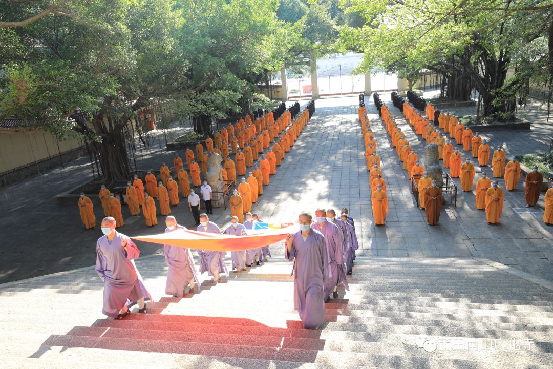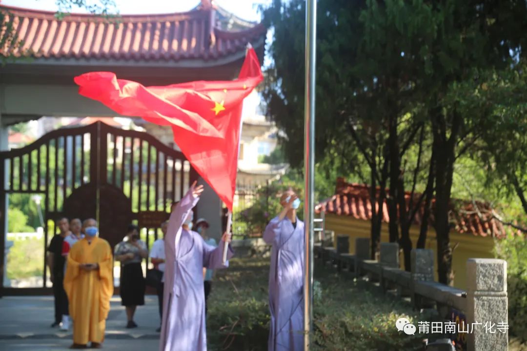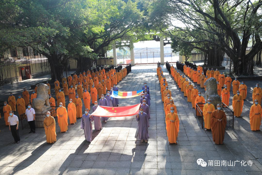 2022年10月1日早,为庆祝祖国华诞,莆田南山广化寺常住与福建佛学院学僧齐聚在山门广场举行升旗仪式。