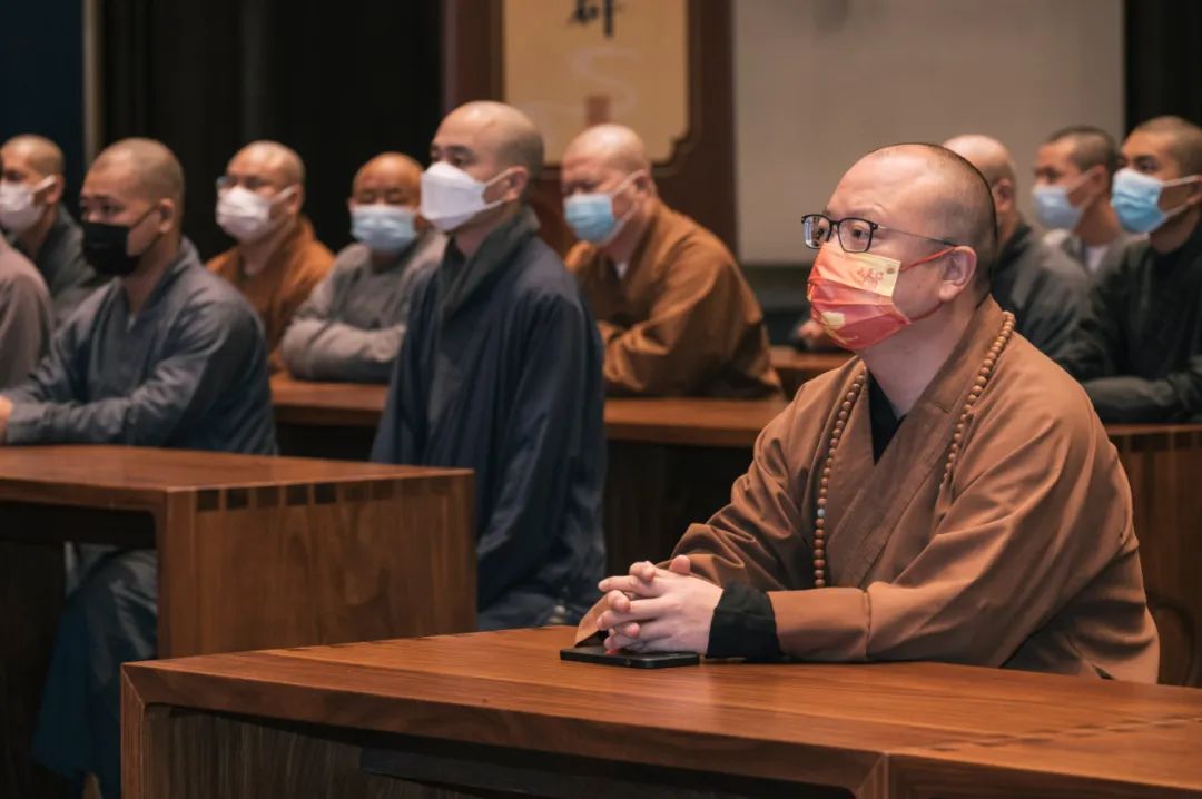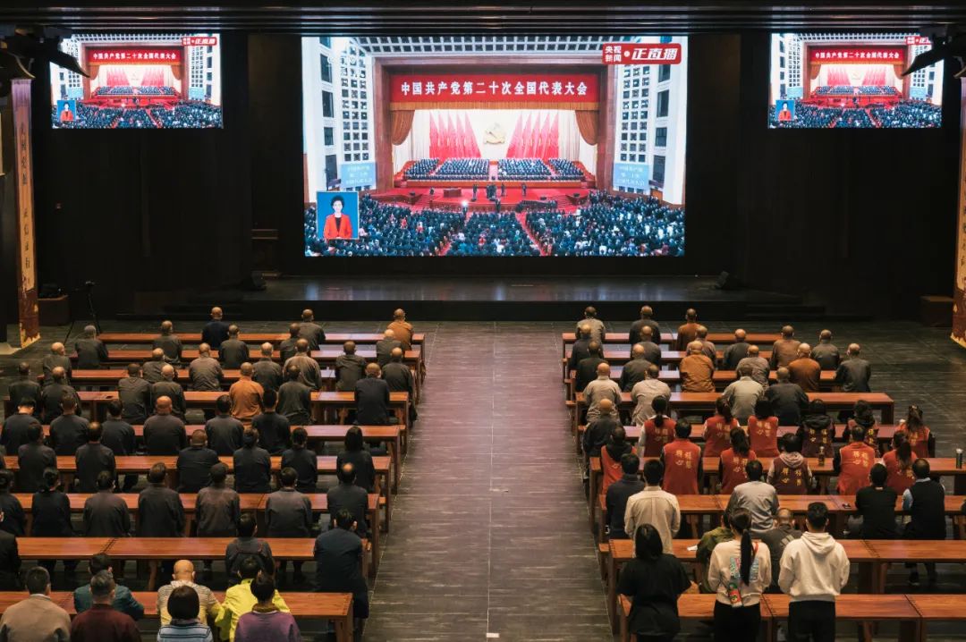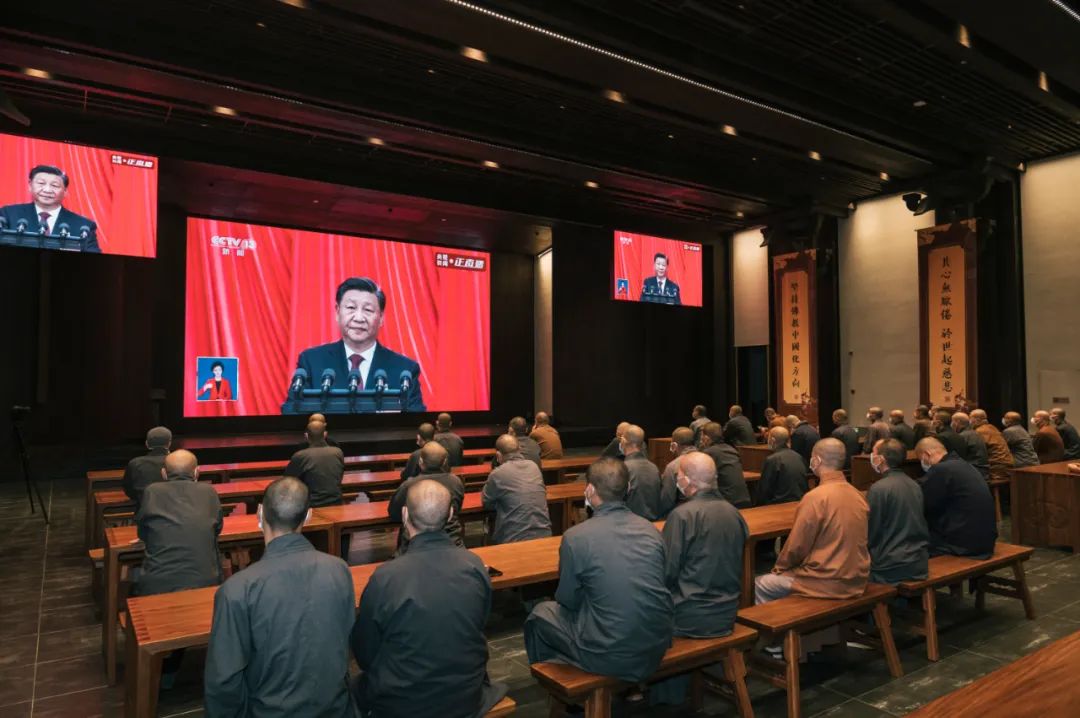 2022年10月16日上午,径山禅寺全体僧众、职工齐聚五观堂多功能厅,收看党的二十大开幕式实况直播。