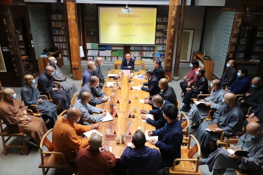 2022年10月26日,衢州市佛教协会在宗教有礼园召开三届九次会长会议暨三届四次理事会议。会议由妙泽法师主持。市佛协秘书长以上人员、第三届全体理事参加会议,监事及有关负责人列席会议。衢州市委常委、统战部部长张晓峰出席会议并讲话。