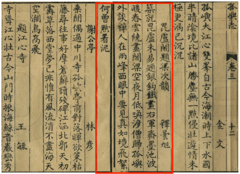 伦公圆寂后,昙旭禅师代领其职。宣德三年(1428),江心寺楼阁堂宇毁于飓风。何文渊《谢公亭记》中记载,昙旭禅师“既重建毗卢阁、讲堂、钟鼓楼、僧房庖舍千有余间,又增修谢公亭于旧基石崖之上,其亭十楹,高一丈二尺,深一丈六尺”。昙旭禅师亲作题毗卢阁的诗: