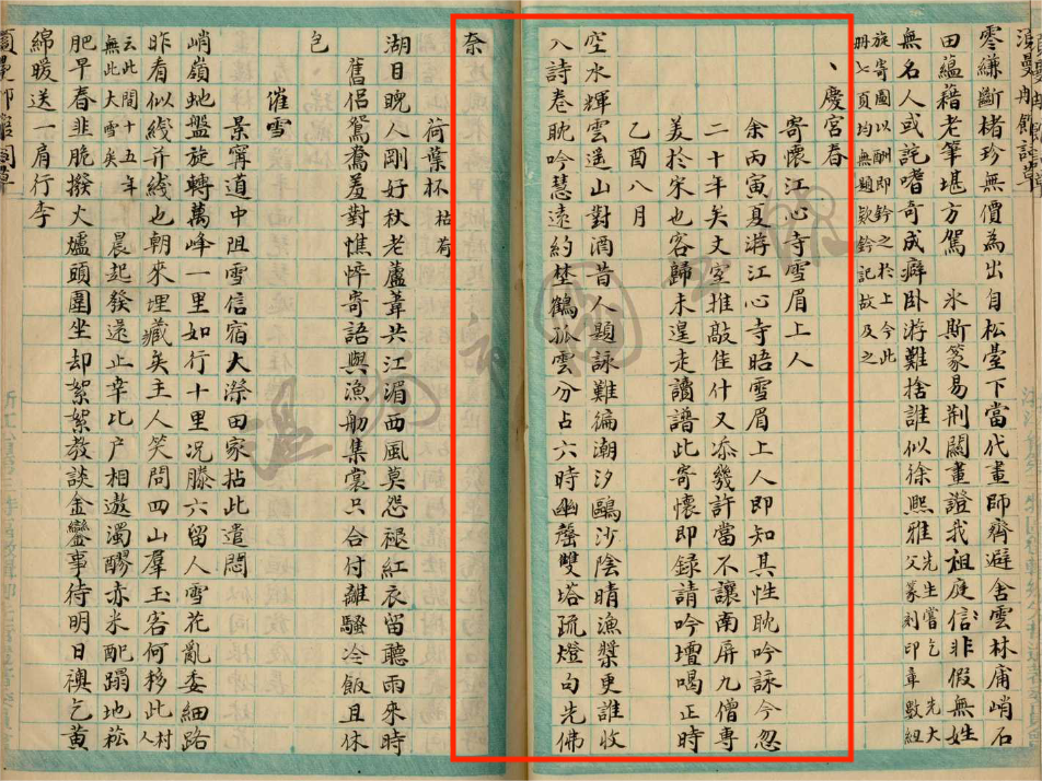 “今忽二十年矣,丈室推敲佳什又添几许,当不让南屏九僧专美于宋。”光绪十一年(1885),潘其祝作《庆宫春·寄怀江心寺雪眉上人》: