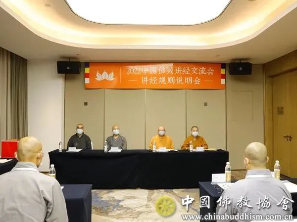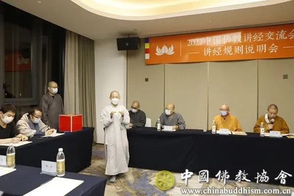 2022年11月3日晚,2022中国佛教讲经交流会规则说明会在浙江湖州举行。中国佛教协会驻会副秘书长宏度法师,中国佛教协会副秘书长、浙江省佛教协会会长、中国佛教讲经交流基地主任光泉法师、中国佛教协会教务部负责人,以及参加本次中国佛教讲经交流会的25位讲经法师共同出席讲经规则说明会。