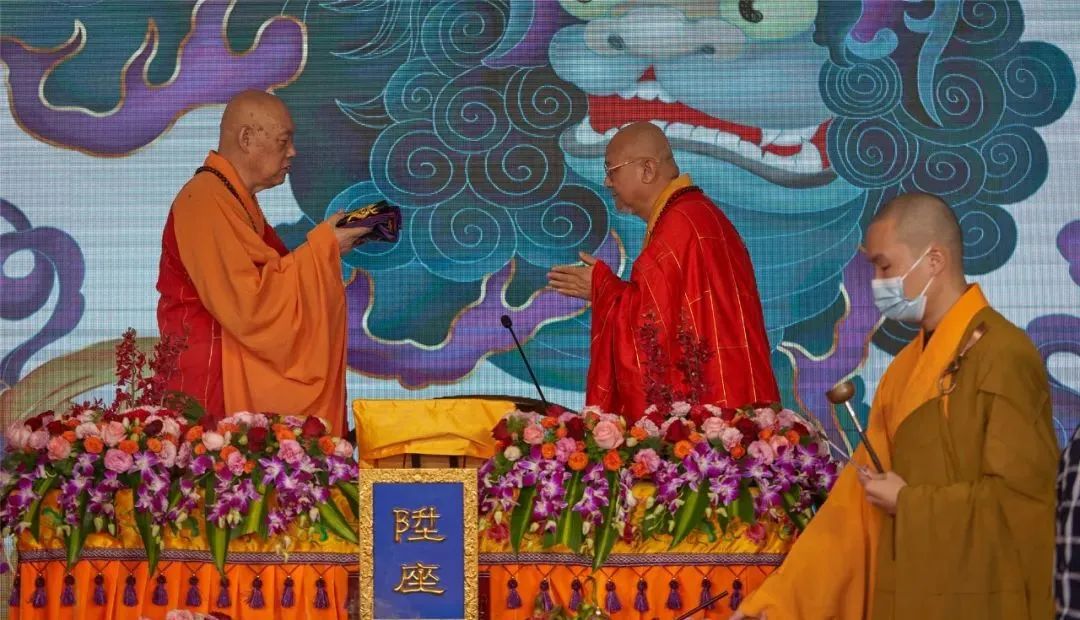 当日上午,大憨法师在两序大众的迎请下步入山门,升座仪式礼请诸山长老分别向大憨法师授衣、珠、具、钵、如意、拂尘、禅杖、锡杖等法器。随后,大憨法师登法王座,作狮子吼,三秉拂尘,拈香祝祷。