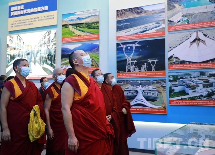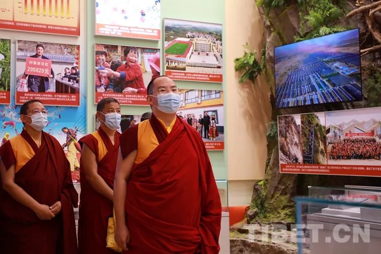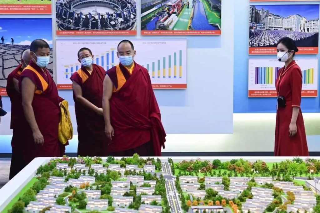 在西藏展区,多幅照片展示出新时代西藏交通网络、能源体系、保障性住房、医疗文教、生态保护等多方面的成就与巨变,以及各族群众和睦相处的影像,各对口援藏省市援建的“连心桥”、蔬菜种植基地等惠民项目。班禅看到新时代十年来西藏经济社会各领域翻天覆地的发展变化,深有感触地说:“近些年来,我在西藏经常走村入户、深入基层,其中有两样东西最常见、印象最深,一是五星红旗,二是老百姓发自内心流露出来的笑容。五星红旗代表着各族群众对伟大祖国的热爱、对中国共产党的拥护、对人民领袖的爱戴,流露出来的笑容充分体现了新时代十年以来我们各族群众的获得感、幸福感。”