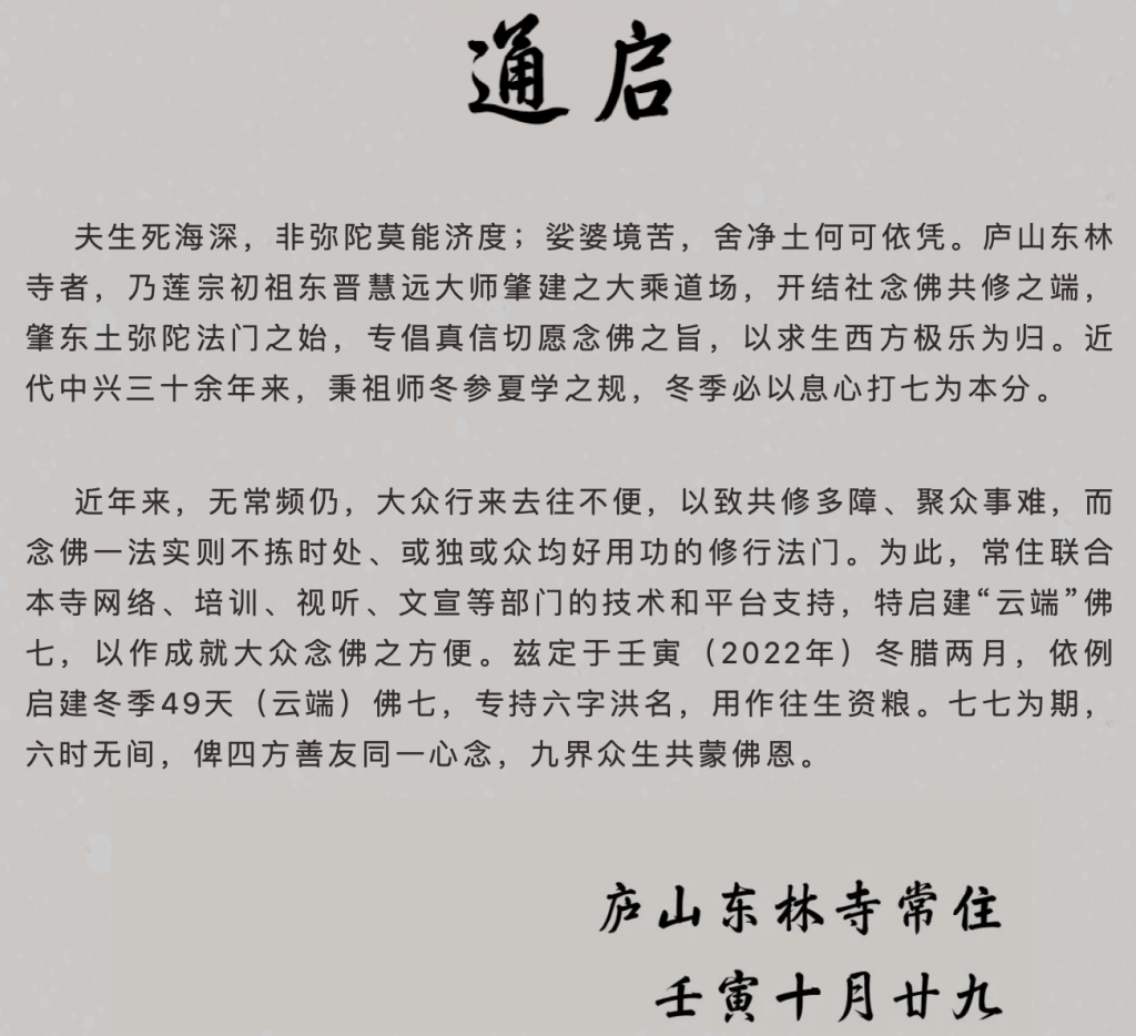 此次冬季(云端)佛七分两个阶段,网络上的莲友可根据自己的实际情况进行参与。