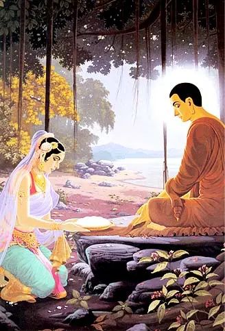 经过六年苦修,悉达多太子形体枯瘦,心身衰竭,但始终未能得道。太子领悟到,解脱生死之大事,光靠肉体受苦是不行的。于是他走出苦行林,来到伽倻山附近的尼连禅河畔,准备用清水洗去身上的污垢。因常年苦修,身体虚弱,而倒在河边的沙滩上。幸有一位牧羊女碰巧路过,供养乳糜,太子才恢复了气力。