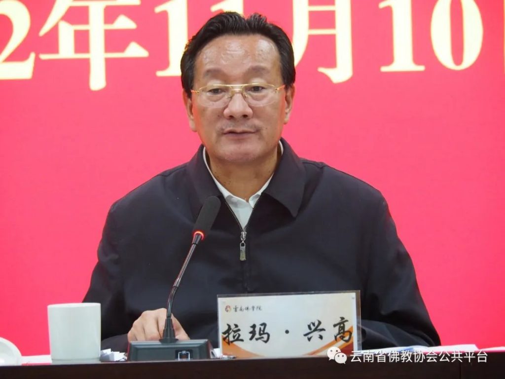 拉玛·兴高在讲话中说:要通过研讨会的形式,研究云南佛教推进中国化的各项工作,对如何推进云南佛教与社会主义社会相适应方面、对如何推进云南佛教传承优良传统等方面,集思广益,深入探讨。要深入学习贯彻党的二十大精神,坚持云南佛教中国化方向,促进云南佛教与社会主义社会相适应,努力推动云南佛教健康传承,为云南社会主义现代化建设事业积极贡献力量。 拉玛·兴高对云南省佛教协会提出了要求:要敢于担当作为,要建立云南佛教新时代人才培养机制,建立起中长期培养计划和方案,按照“四条标准”来培养僧才。加强政治教育、法制教育、文化教育,引导寺院管理者(方丈、住持、祜巴、活佛等)加强学习与管理水平。全省佛教界要在大是大非中经得起考验,对云南佛教投一份感情、讲一句好话,三语系佛教要团结一心,共同推进云南佛教全面发展。
