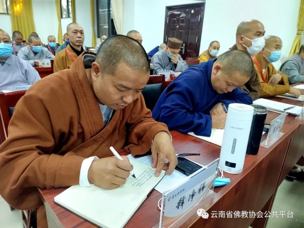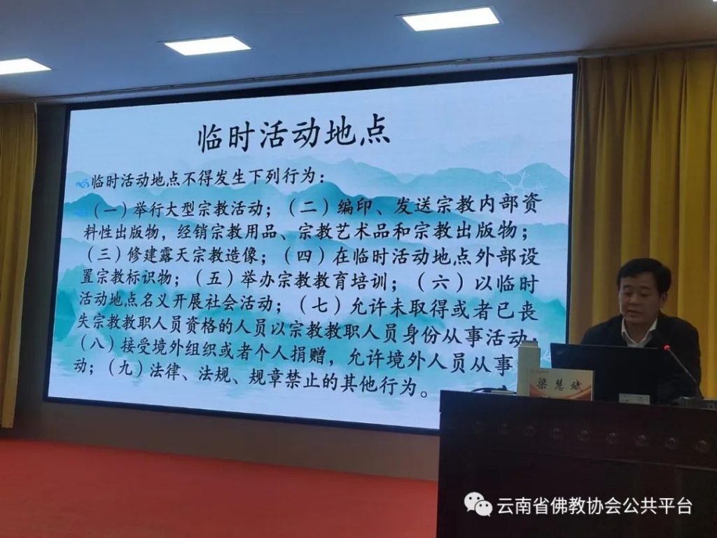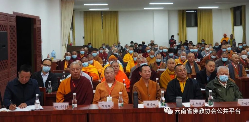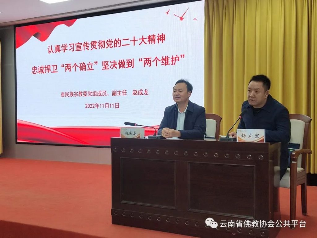 省民族宗教委党组成员、副主任赵成龙《党的二十大精神宣讲》中强调:全省佛教界要认真学习贯彻党的二十大精神,忠诚捍卫“两个确立”,坚决做到“两个维护”。云南佛教要找准贯彻落实的切入点、着力点,以实际行动为党和国家事业发展、实现第二个百年奋斗目标作出应有贡献。