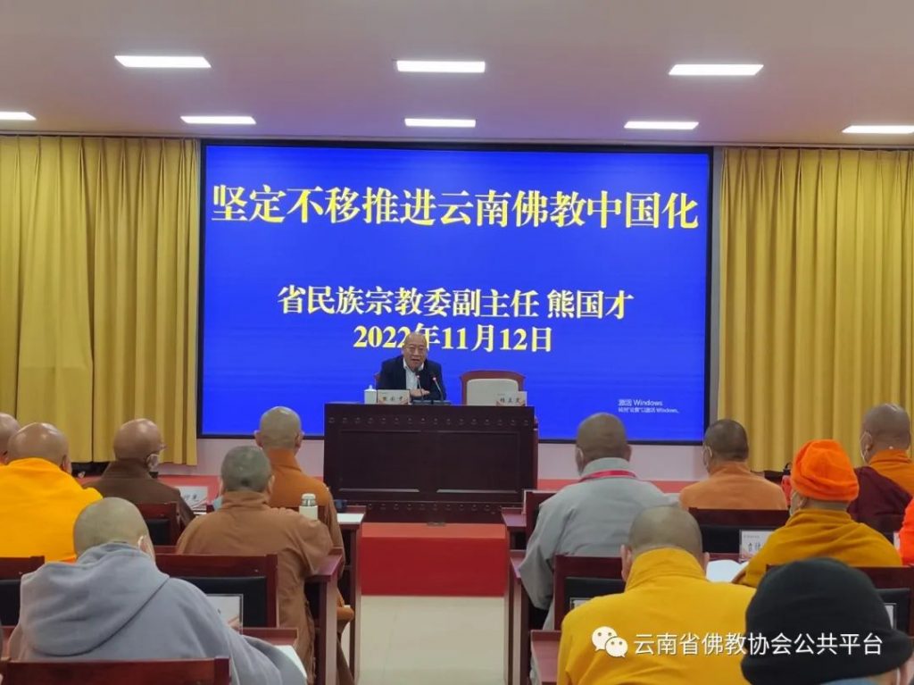 省民族宗教委党组成员、副主任熊国才在《坚定不移推进云南佛教中国化》专题授课中,从“为什么要推进佛教中国化”、“推进佛教中国化的方向”、“谁来推进”、“怎样推进”四个方面进行了详细的讲解。推进中国化进程是为了帮助宗教更好地融入时代。要以“社会主义核心价值观”为引领,在文化上自觉融合,长期、有效的服务群众。