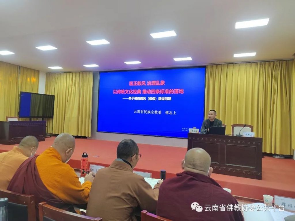 省民族宗教委宗教业务四处一级调研员傅志上以多年宗教工作者角度,以《匡正教风治理乱象 以传统文化经典,推动四条标准的落地》为题,对云南佛教教风建设、信仰建设存在的问题进行了剖析。