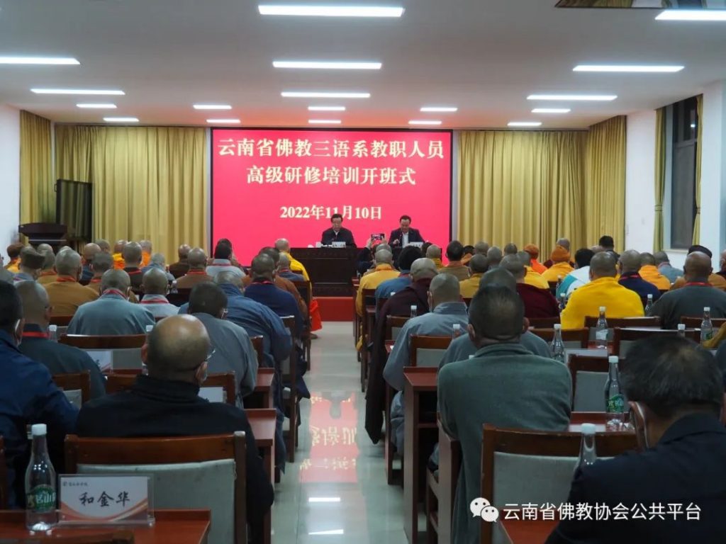 2022年11月10日至13日,由云南省民族宗教委主办、云南省佛教协会承办、云南系佛学院协办的“云南省佛教三语系教职人员高级研修班”在云南佛学院圆满举行。来自云南佛教三语系的帕松列、祜巴、方丈、活佛及各州市佛协会长、重点寺院住持一百二十余人参加研修班。云南省委统战部副部长、云南省民族宗教委党组书记、主任拉玛·兴高出席开班式并讲话。省民族宗教委党组成员、副主任赵成龙住持开班式。