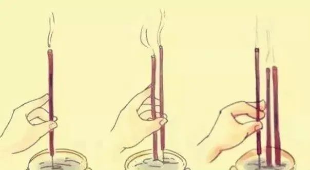 第一根檀香用左手拈起,右手接过送入;第二支则利用右手拈起,左手送入;第三支又和第一支一样。