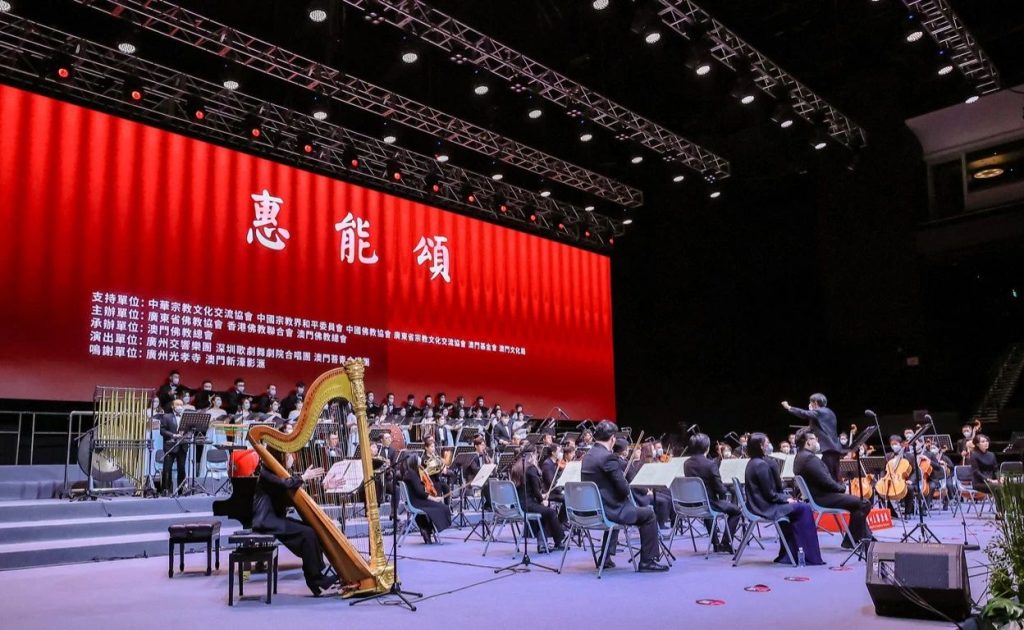 2022年12月18日晚,《惠能颂》交响音乐会世界巡演澳门首演在澳门新濠影汇综艺馆举行。《惠能颂》交响音乐会是粤港澳大湾区宗教文化交流系列活动的重要环节,由中国音乐家协会副主席余隆担任艺术顾问,中国佛教协会副会长明生法师、香港佛教联合会会长宽运法师、澳门佛教总会会长戒晟法师担任总策划,著名作曲家李海鹰创作并指挥。