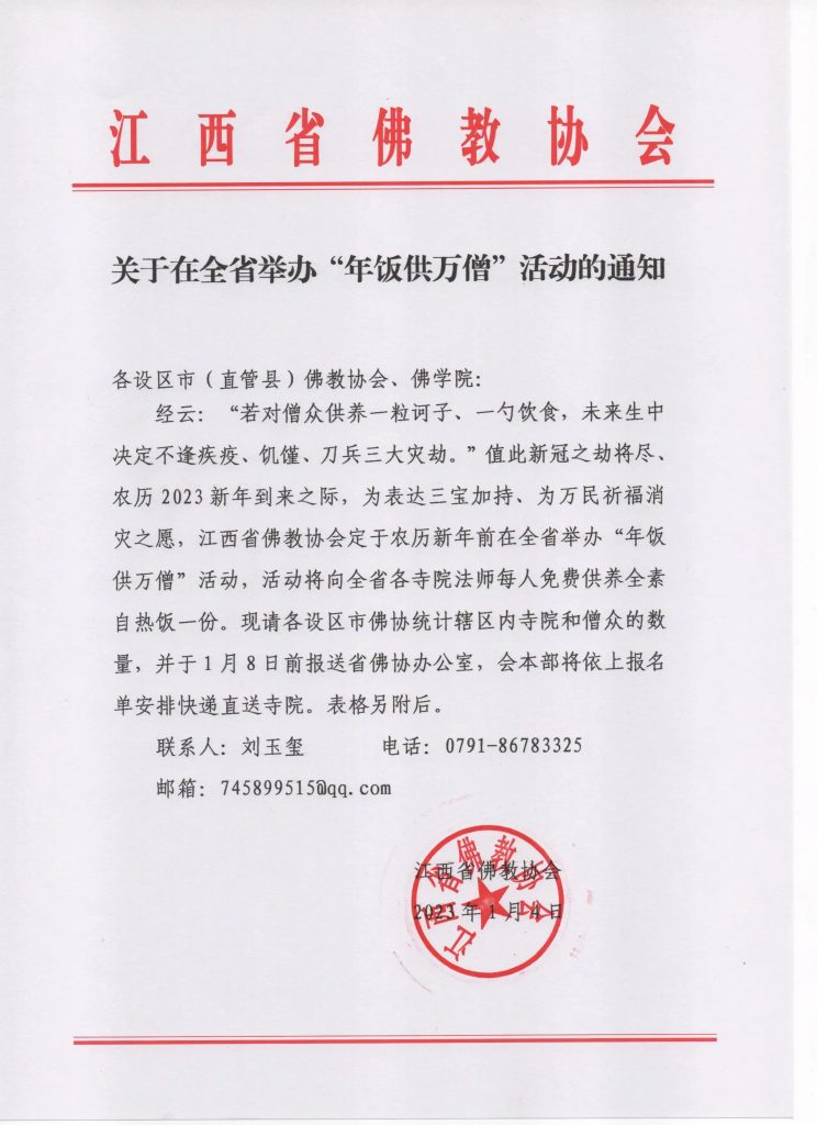 江西省举办“年饭供万僧”活动的通知 编辑 志斌 • 2023年1月4日 下午4:11 • 资讯 来源:江西省佛教协会 时间:2023-01-04 本网站属于非赢利性网站,转载的文章遵循原作者的版权声明,如有版权异议,请联系值班编辑予以删除。 联系方式:0591-83056739-818 18950442781 赞 (0) 编辑 志斌 0 0 生成海报 “建构新时代人间佛教思想体系”——2022年人间佛教思想建设研讨会专家学者发言与论文观点摘编 上一篇 2023年1月4日 下午4:08 普陀山佛教协会召开2022年度慈善工作座谈会 下一篇 2023年1月4日 下午4:25 相关推荐 资讯 忏摩罪业 戒和尚开示 | 戒子期待禀受清净戒法 400 smy 2023年5月24日 资讯 新年必囤——冬藏能量大包全新上市 000 编辑:庄雅婷 2025年1月18日 专题 传戒通启 | 广东省佛教协会暨云门山大觉禅寺2025年秋季传授二部僧三坛大戒通启 000 三三两两 2025年2月28日 资讯 党的二十大胜利召开在江西省佛教界引起热烈反响(三) 000 编辑 志斌 2022年10月19日 资讯 仅需百元【中国风羊脂玉手串】美到窒息! 轻松get“轻奢·国潮·禅意”,时刻绽放独特中国美 000 编辑:庄雅婷 2025年5月29日 资讯 湖南省佛教协会第七期教职人员培训班在大唐兴寺举行开班仪式 000 smy 2023年6月2日 资讯 恭迎韦驮菩萨圣诞丨祈愿国泰民安、正法久住、四众吉祥 000 三三两两 2024年7月8日 资讯 【喜迎二十大】上海地藏古寺组织全体僧职工收看党的二十大开幕式 000 编辑 志斌 2022年10月18日 资讯 全国性宗教团体联席会议学习贯彻习近平总书记关于宗教工作的重要论述研讨会精神 000 smy 2023年7月3日 资讯 福建省佛教协会第28次传授三坛大戒法会之仙游龙华寺:教过堂规矩、教诫行仪、教习穿袍、搭衣、展具 000 编辑 志斌 2022年11月5日 发表回复 您的邮箱地址不会被公开。 必填项已用 * 标注*昵称: *邮箱: 网址: 记住昵称、邮箱和网址,下次评论免输入 提交