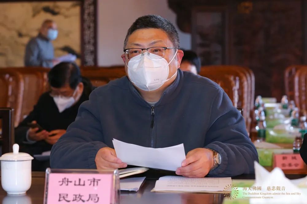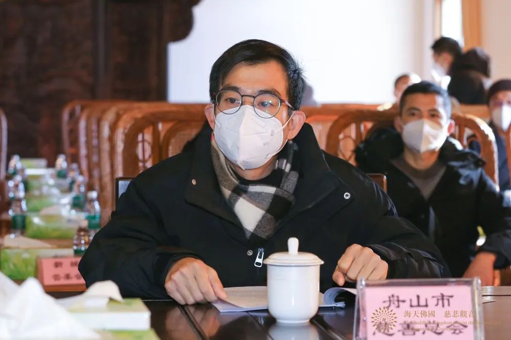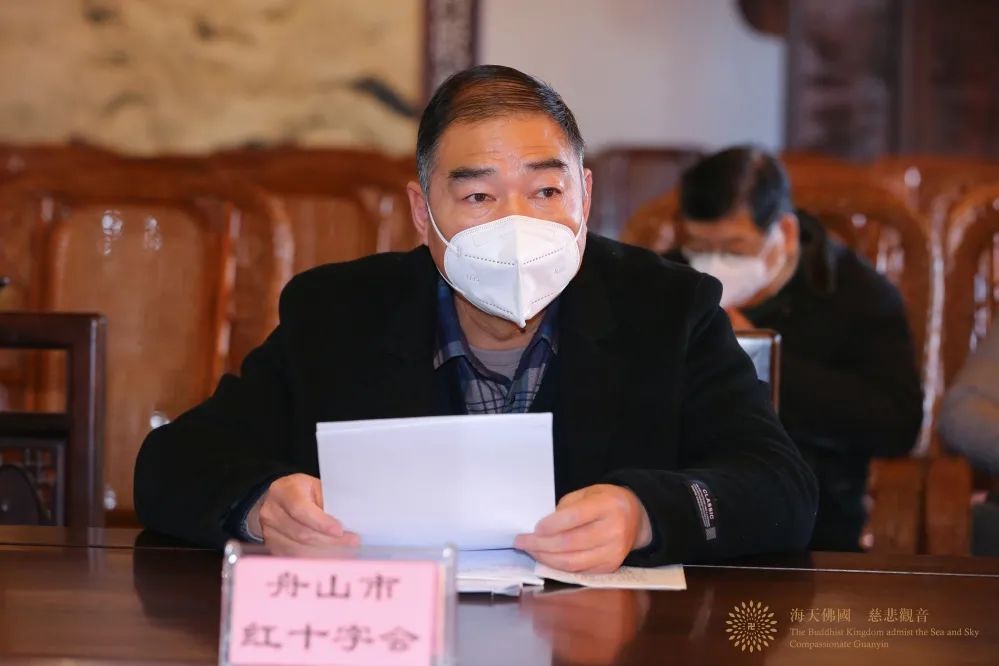 中国佛教协会副会长、普陀山佛教协会会长、中国佛学院普陀山学院院长、观音法界管理中心主任、普济禅寺方丈道慈大和尚,普陀山佛教协会副会长信光法师(常务)、惟航法师、智宗法师(兼秘书长)、门肃法师、会闲法师、定明法师、心遐法师,市委统战部民宗一处处长王德宽,普陀山-朱家尖管委会党群工作部副部长林金松,以及市民政局、市慈善总会、市红十字会、市特殊教育学校、市志愿者协会、市癌症康复协会、普陀区慈善总会、普陀山普济医院、普陀山敬老院等单位代表参加会议。会议由心遐法师主持。