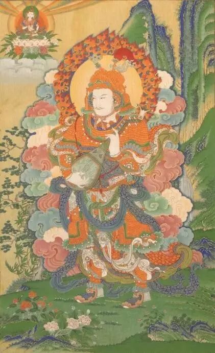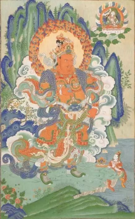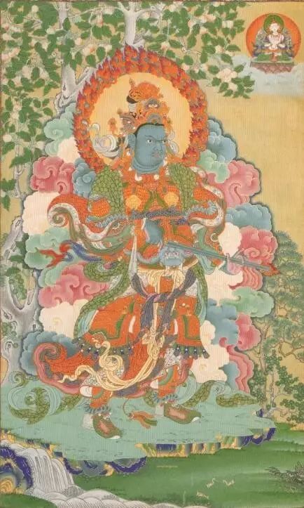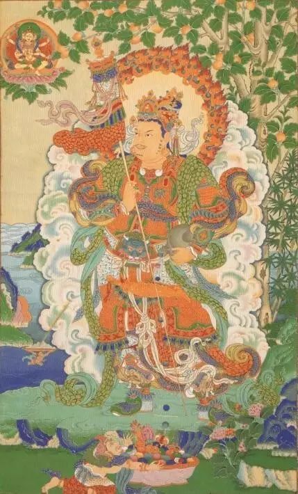 北方多闻天王:(梵文:Vaiśravaṇa;藏名:Rnam-thos-kyi-bu / Jambhala):又名毗沙门,“多闻”意为颇精通佛法,以福、德闻于四方。住须弥山黄金埵,身为绿色,穿甲胄,左手卧银鼠,右持宝伞(或作宝幡),有两义:一:伞盖代表要保护自己的内心不受外面环境染污;二、用以遮蔽世间,避免魔神危害,以护持人民财富。又名施财天,是古印度的财神。他负责守护北俱芦洲,以夜叉与罗刹为多闻天王的部众,是‘二十诸天’中的第三天王。