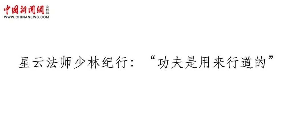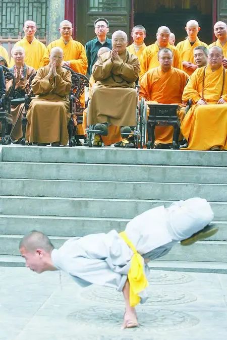 大雄宝殿拈香礼佛,藏经阁里序数经典,之后,星云法师便落座方丈室前观赏少林武僧的功夫表演。一招一式的少林功夫绝技让老和尚看得目不转睛,每一个套路完成后都认真鼓掌致意。功夫表演结束,星云法师起身,武僧们围上来合影后仍不舍得离去,老和尚便站在那里为年轻的武僧即兴开示:多少年来,我仰慕少林、仰慕永信方丈,缘于我们沾少林寺的光,在世界许多地方,“老外”看到我穿的这个衣服就喊“少林”,表示敬佩,他们是通过少林武功认识了佛教、认识了中国文化,便生出敬佩之心来。我是扬州乡下的一个孩子,12岁出家到南京栖霞山就看到过少林秘笈,后来在焦山寺见到一位少林和尚跳起来有一丈多高,便对少林心向往之。我要给你们说的是,功夫是用来行道的,行正道的,这个你们要研究。怎么行道?就像少林和尚帮李世民平叛建大唐就是一种行道,救世救人就是行道。如今,面对现代武器肉身的功夫有什么作用?我说有用,有大用,对修习功夫的人是修身和修心并重,道德品格的修习要求对文僧和武僧是同样的,要通过身心的修习达到文化的传承播衍,这是你们要继承发扬的。再就是修习佛法也好,修习功夫也好,就得认真深入,要把名利心放在一边,这也有助于行道。