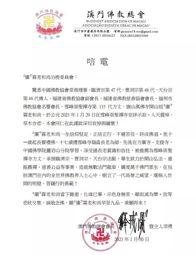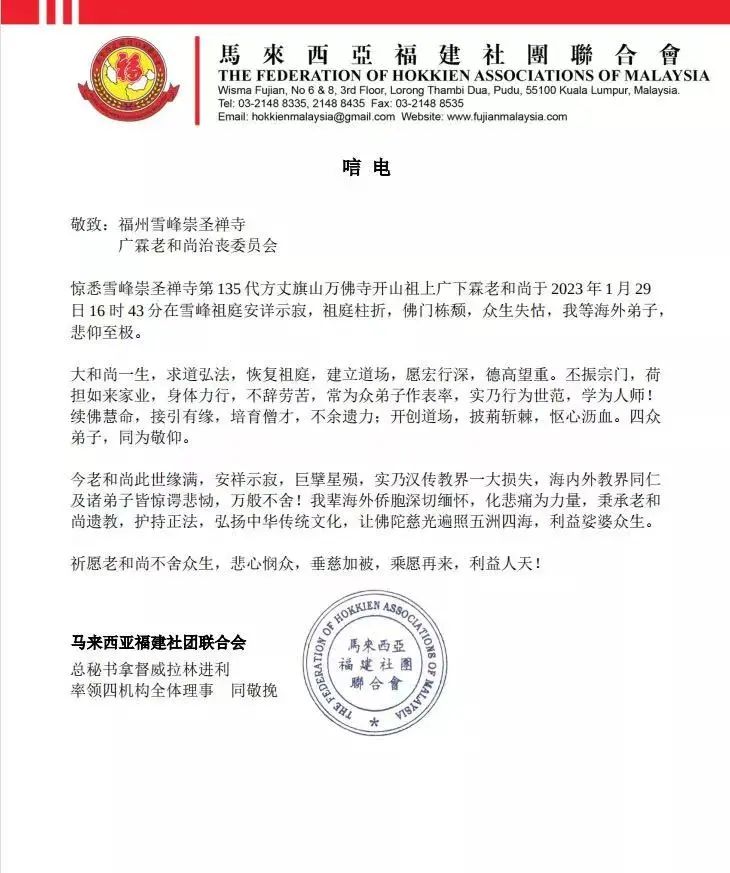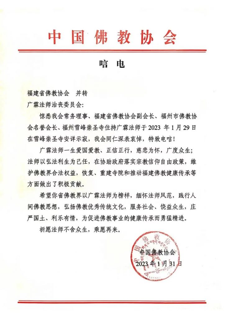 张忠发先生对广霖老和尚的辞世致以深切哀悼,他说,广霖老和尚弘法利生,慈悲济世,始终秉承爱国爱教、护国利民的优良传统,团结引领广大佛教信众,坚定拥护中国共产党领导,在推进佛教中国化、闽台佛教交流交往、培养优秀僧才、弘扬祖庭文化等方面都作出了重要贡献。广霖老和尚是党和政府亲密的朋友,是佛教中国化的坚定践行者,也是禅宗祖庭文化的传承典范。斯人已逝,风范长存,希望全省佛教界能发扬广霖老和尚精神,为全面建设社会主义现代化国家福建篇章和全面推进中华民族伟大复兴作出新的更大贡献。