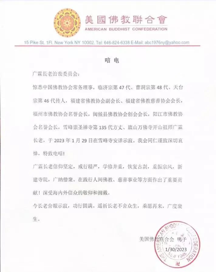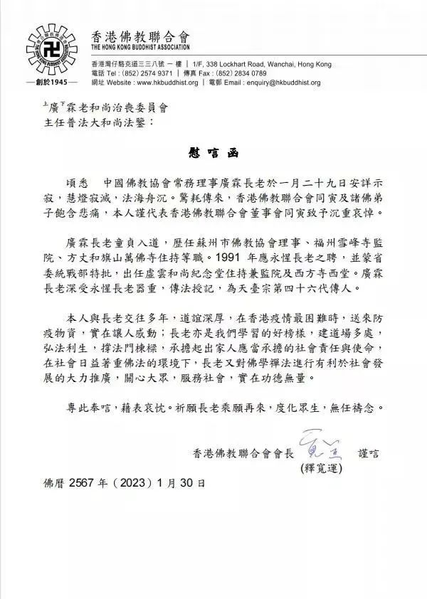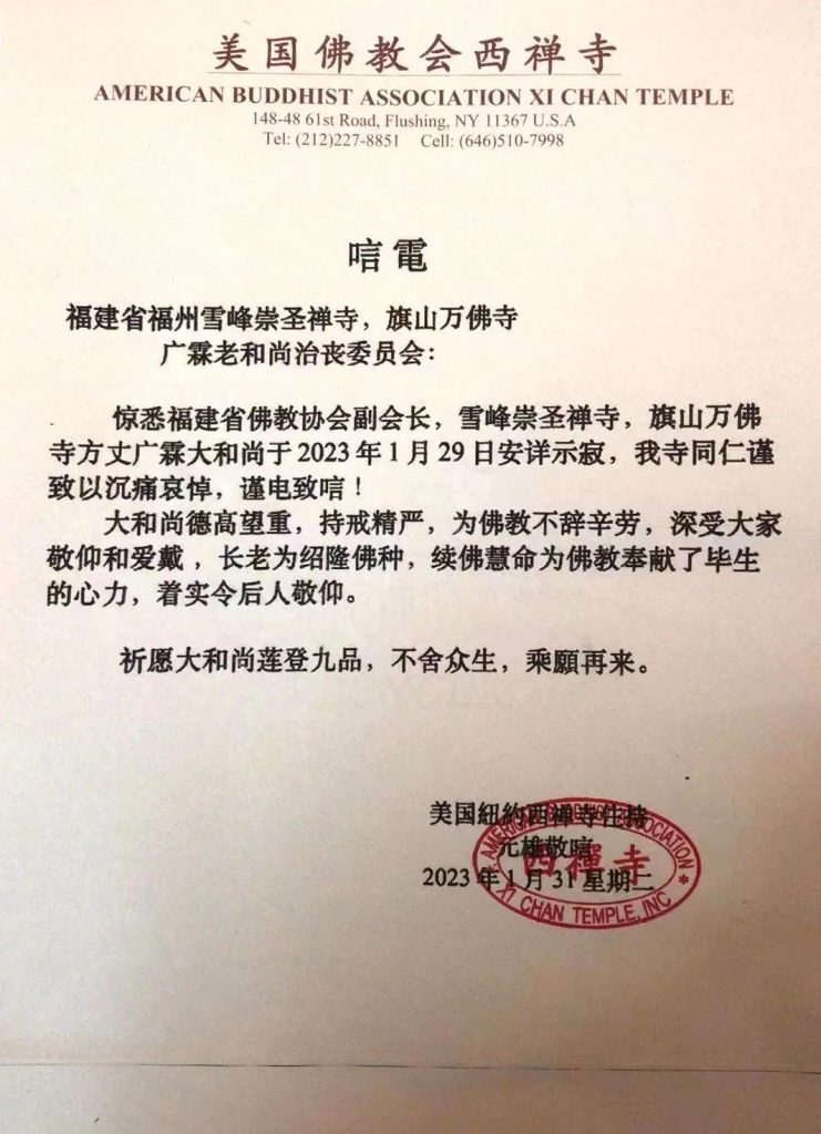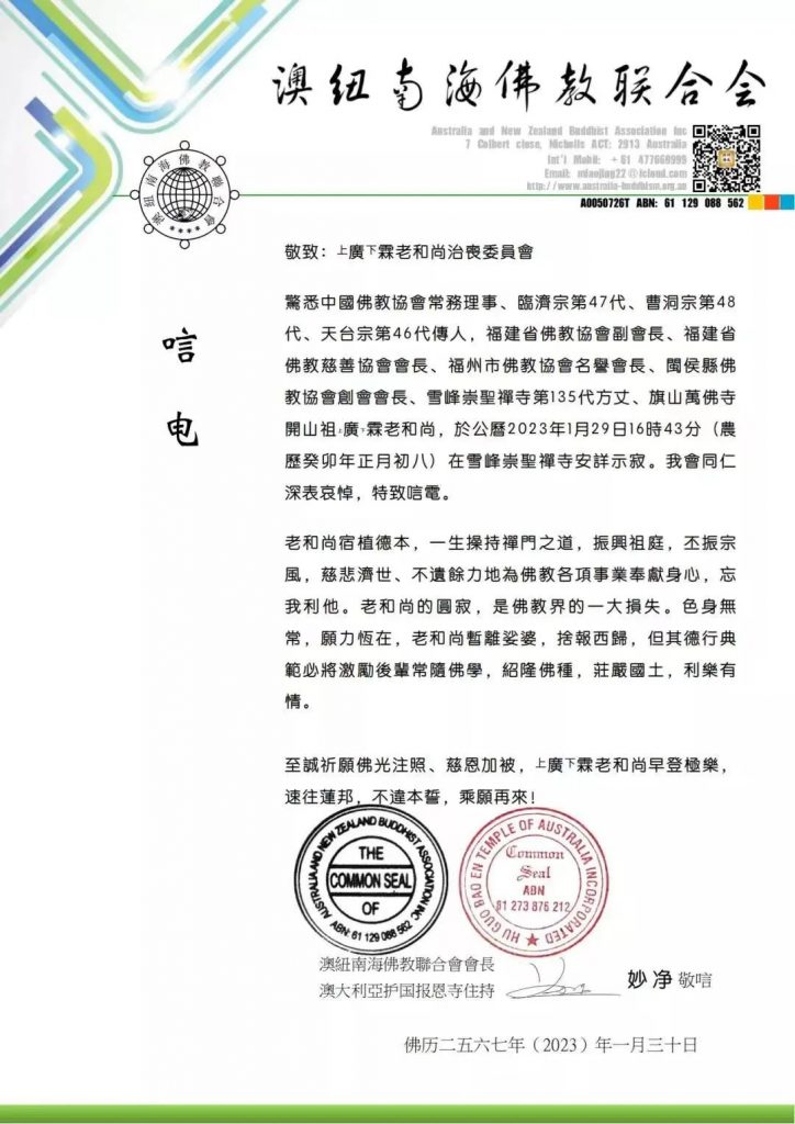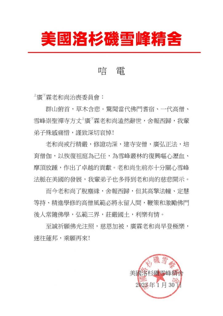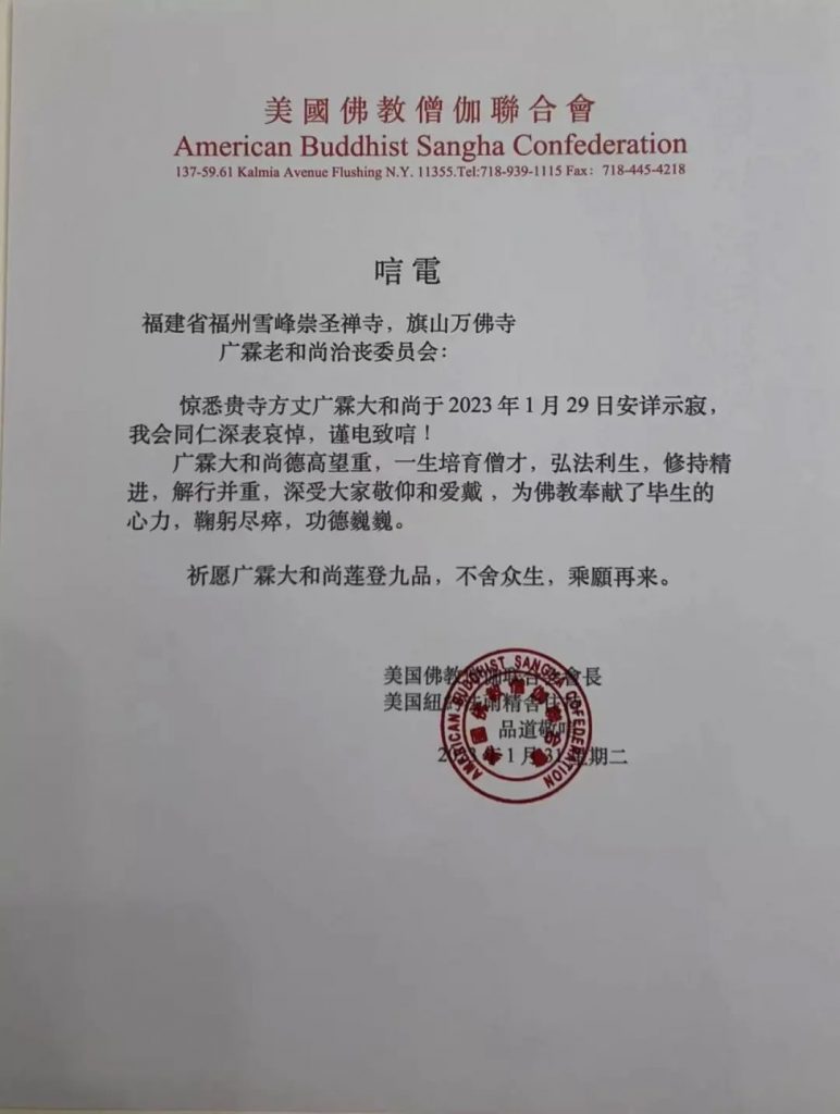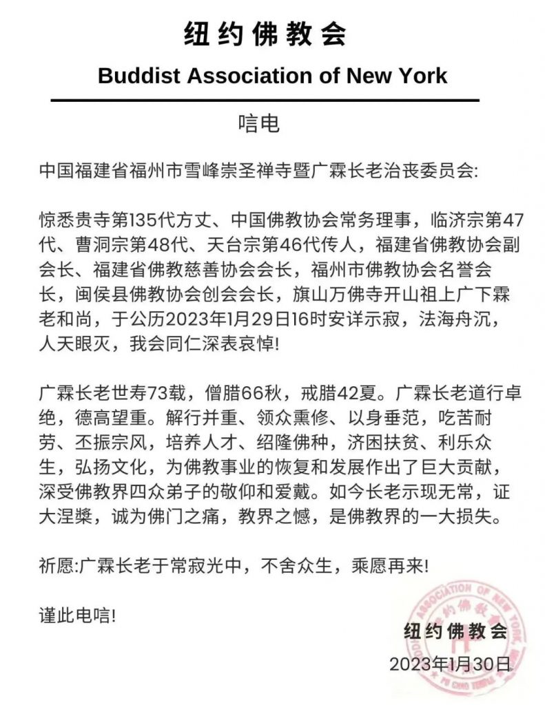 2023年2月8日上午,中国佛教协会常务理事,临济宗第47代、曹洞宗第48代、天台宗第46代传人,福建省佛教协会副会长、福建省佛教慈善协会会长,福州市佛教协会名誉会长,福州高新区佛教协会、闽侯县佛教协会创会会长,雪峰崇圣禅寺第135代方丈、旗山万佛寺开山祖上广下霖老和尚追思会在福州万佛寺举行。国内外诸多单位、寺院通过致唁电、挽幛、挽联、敬献花篮等方式悼念,省委统战部、省民族宗教厅、香港佛教联合会及各级相关部门负责人、佛教界同仁、居士信众及社会各界人士纷纷前来吊唁。