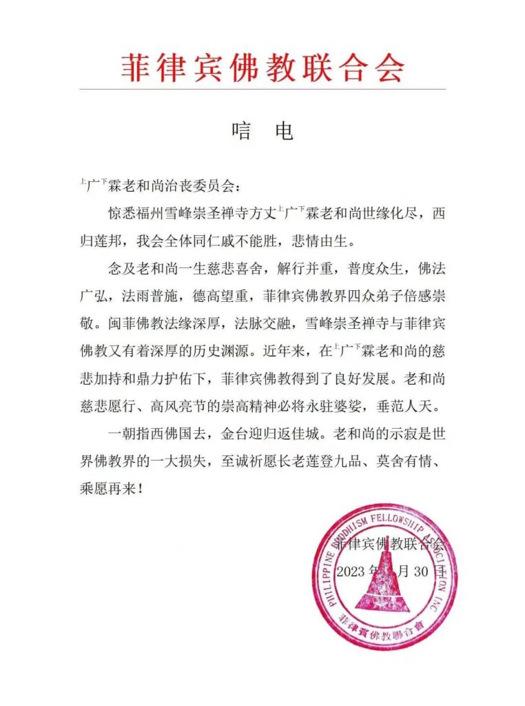 治丧期间,前来吊唁的还有福建省佛教协会常务副会长则悟法师、本性法师、向愿法师,副会长如妙法师、心亮法师、贤志法师、世起法师、修达法师、界象法师、法云法师、法源法师、法众法师、法一法师、常定法师、空性法师、贤立法师、界空法师,副秘书长照开法师、灵耀法师、陈海平先生、法度法师、妙登法师、浩宇法师、净心法师、妙空法师、妙光法师、德昇法师、明性法师、宏玉法师、戒舟法师、本圆法师、林振西先生、光炳法师、光良法师、本通法师、定空法师等。