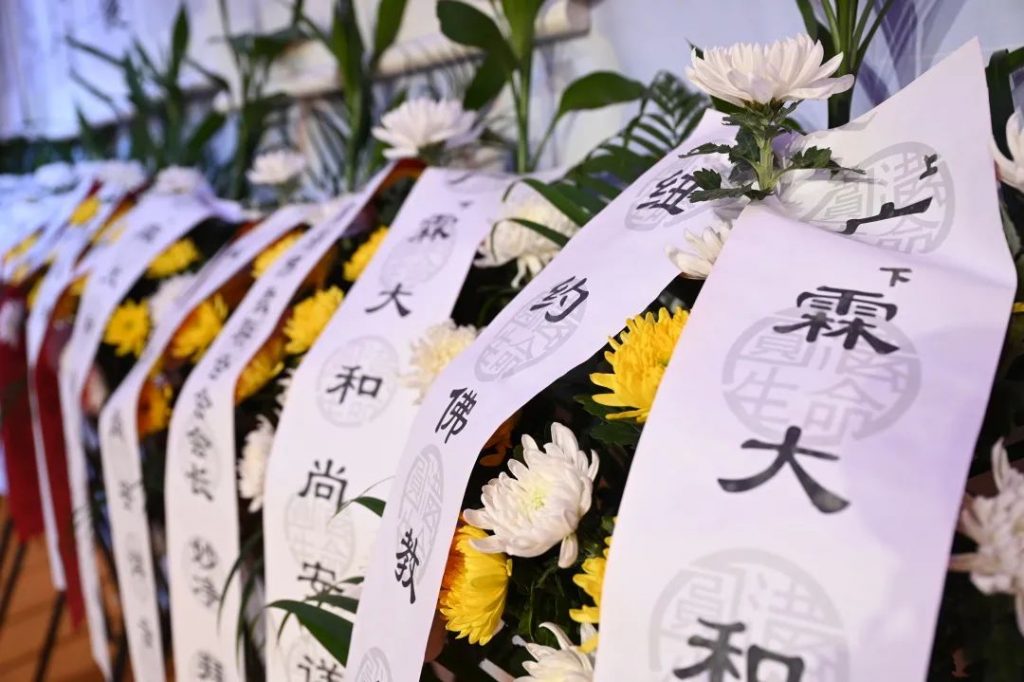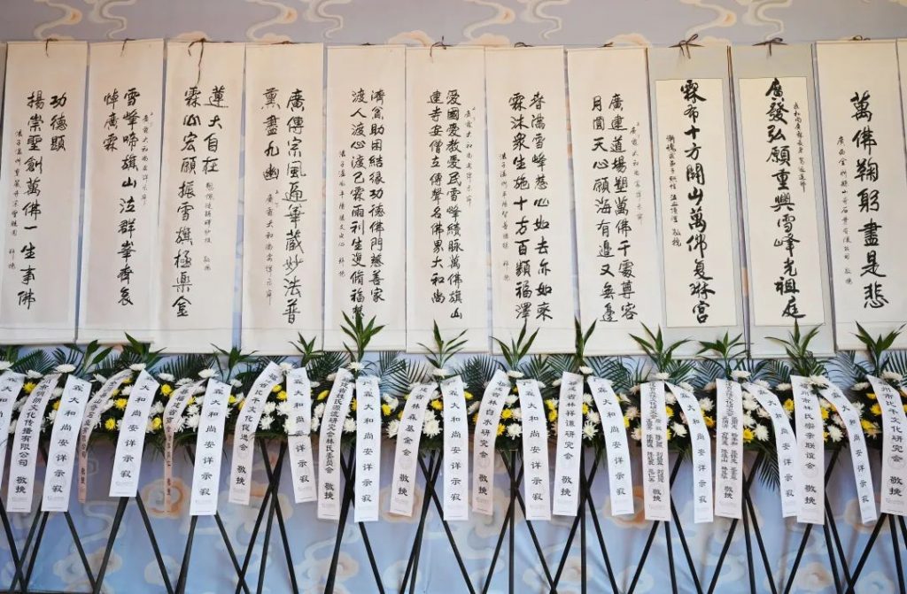 “雪峰化水皆成泪,万佛鞠躬只为悲。”“安僧护法,留伟业丰功,名垂佛界;爱国佑民,秉慈心善举,德润凡尘。”“雪峰啼旗山泣,群峰齐哀悼广霖,扬崇圣创万佛,一生奉佛功德圆。”挽联上一字一句,都在惋惜与哀恸广霖老和尚的离去。