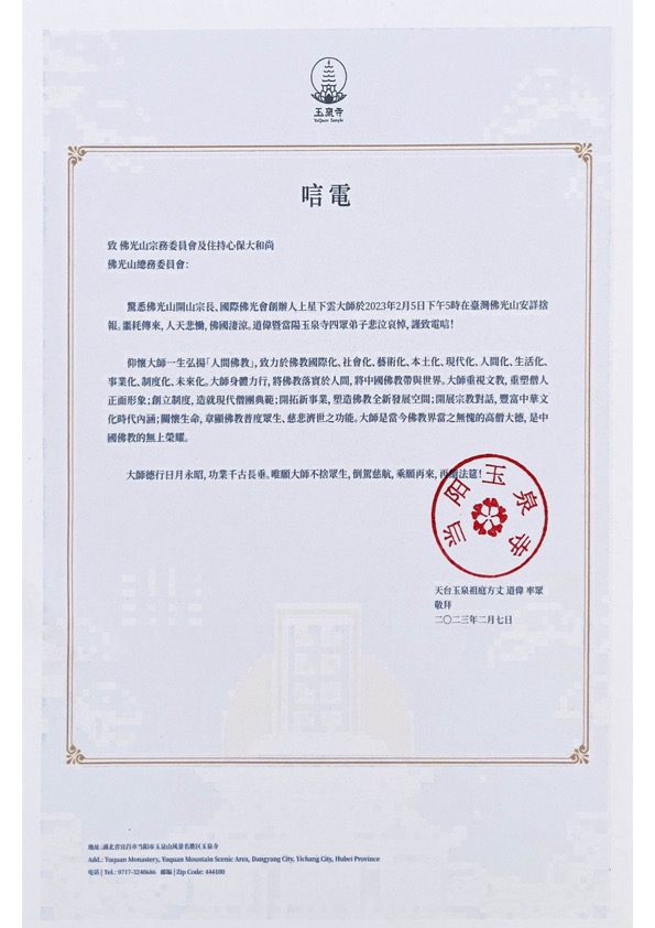 記得二十年前,在台灣南華大學初見大師時如沐春風,巍巍然宛如高山。仰觀大師之功業與行跡,說法利生,應以廣長舌贊之;慈悲濟世,莫非觀自在嘆之。道偉至誠禮敬,願家國風月,朗昭海峽,願大師功德之力,增強休戚與共海峽兩岸之民族認同,撫平兩岸之歷史創傷,終結兩岸之對立。祈願再返娑婆,降生東土,普化群機!