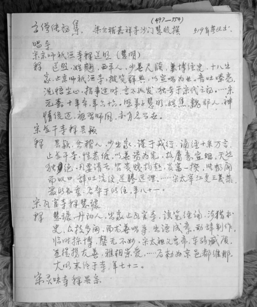 从1978年开始,我先是从古籍中寻找佛教音乐的踪影。那时候,我所要查阅的古书,还都属于“禁书”,不但书店没有,连图书馆也不能借阅。我找到家父的一位时任天津图书馆副馆长的老友“走后门”,为我开了一张只有担负国家课题的大学教授才能有的“内部阅览证”。于是,有两年的时间,我都泡在天津图书馆善本古籍部的一间小小的阅览室,因为书不能借出,只能在那里看。当时还没有发明扫描器,也不可以拍照,只好下笨功夫用笔抄。直到现在,我还保留着几本当时抄录的慧皎《高僧传》、道宣《续高僧传》、道世《法苑珠林》、《晋书·乐志》等书的残破的笔记本。当然,笨也有笨的好处,就是几十年过去了,今天我讲课的时候,有时还能随口引用一些古典,就是因为当年动手用心的缘故。