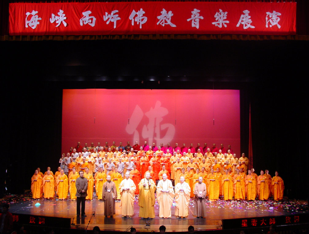 2004年2月15日大陆佛乐团经澳门抵高雄,开启了与佛光山梵呗赞颂团的三场公演,无论是在高雄文化中心的首场演出,还是林口体育馆,“万人禅净密献灯祈福大法会”,还是2月24日在台北“国父”纪念馆的最后一场演出,可谓盛况空前。在演出结束之后,星云大师在现场观众热烈的欢呼声和经久不息的掌声中上台致辞。他说这场演出“把传统的佛教梵呗和现代的乐器融合在一起,把汉传、藏传、南传佛教融合在一起,把静态的禅和动态的武功融合在一起,把海峡两岸佛教徒的心也融合在一起”并告诉大家,我们不但今天在台北写历史,我们还将去香港、澳门、美国的洛杉矶、旧金山和加拿大的温哥华,“以音声做佛事”,用过去只在殿堂里唱诵、而今唱给“现前的诸佛菩萨”听的佛教音乐,来促进世界的和平与进步。