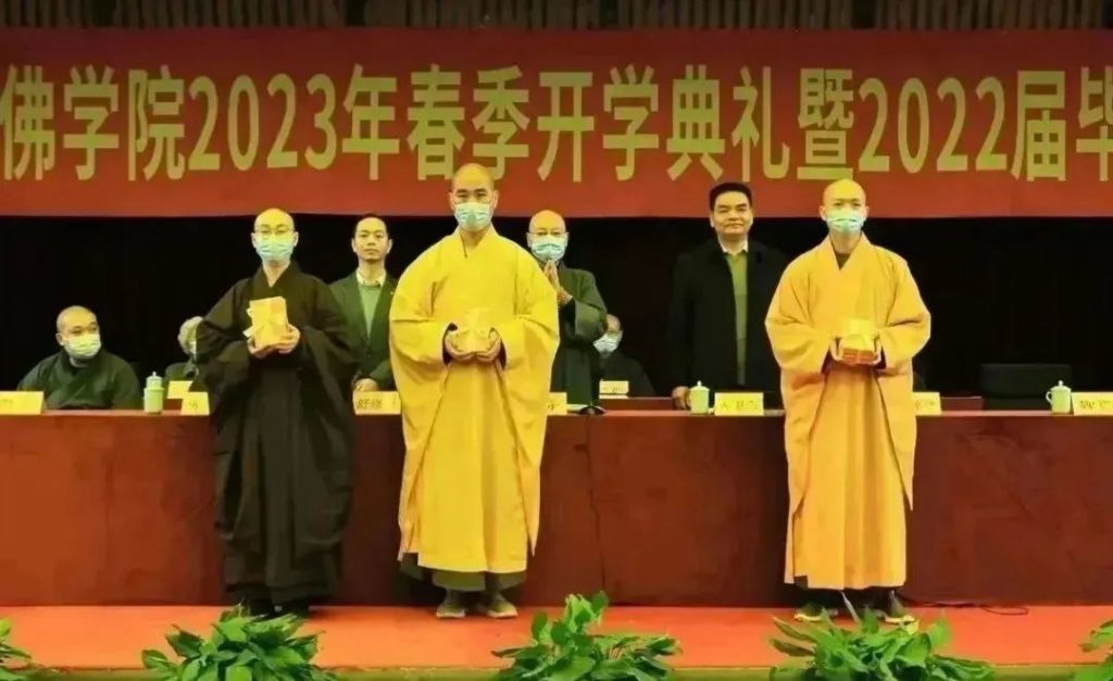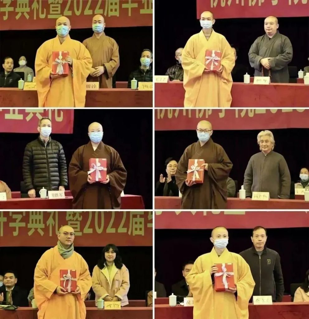 开学典礼上,副院长慧仁法师宣读了2022学年修学进步奖、志愿服务奖,优秀学生奖学金和优秀工作者的名单,莅会领导嘉宾为获奖师生及受聘教授颁发荣誉证书、毕业证书和聘书。随后,2022届优秀毕业生代表上台致答谢辞。