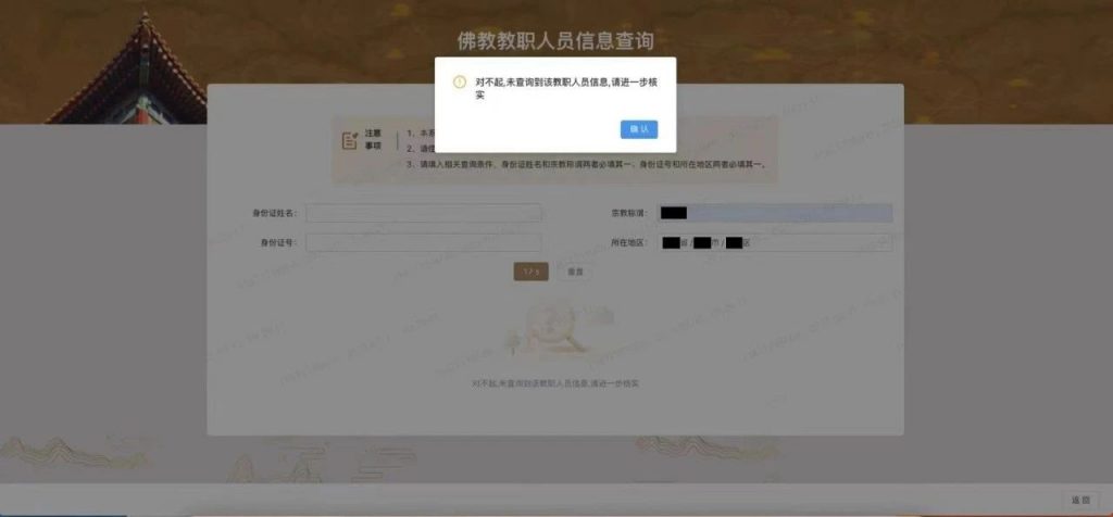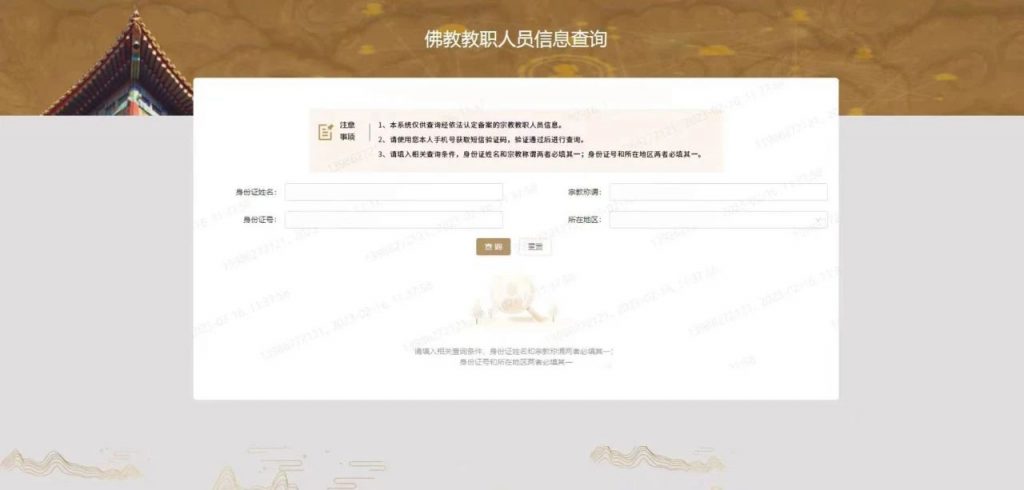 第二步:登录系统后,被查询人的身份证姓名和宗教称谓两者必填其一;身份证号码和所在地区(精确到地级市或直辖市的区)两者必填其一。