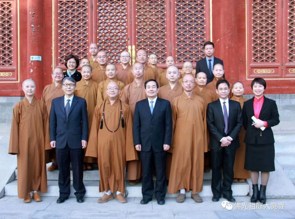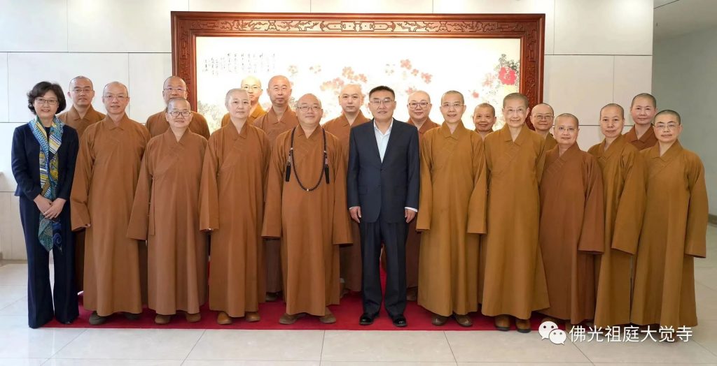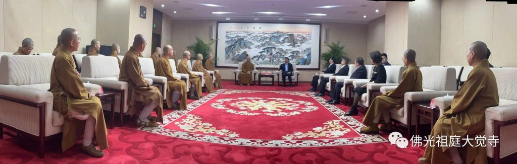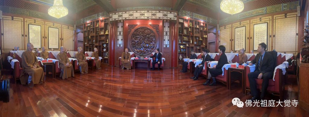 3月2日上午佛光山宗委会宗长心保和尚、佛光山宗委妙士法师、佛陀纪念馆馆长如常法师等代表团一行,前往拜会文化和旅游部副部长卢映川及相关部门领导致谢。