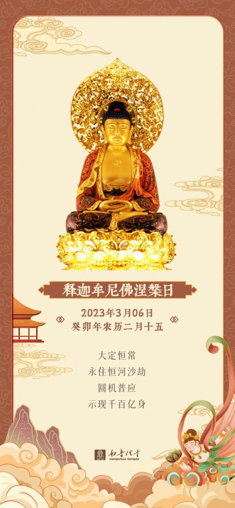 每年的农历二月十五,是释迦牟尼佛涅槃日。释尊于周昭王二十四年降生,一生示现,于周穆王五十二年,世寿八十岁时,示现身疾,在娑罗林中双树之间吉祥而卧,入般涅槃。