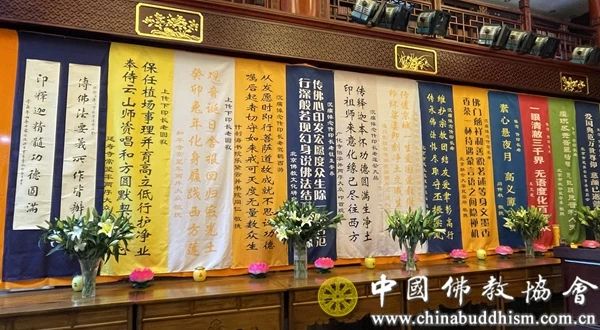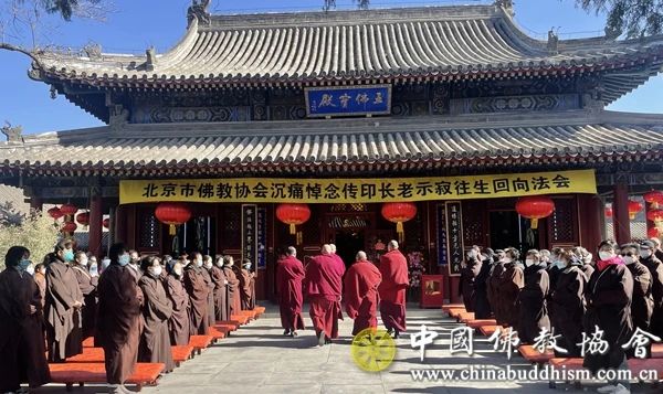 胡雪峰会长、宏度法师、怡学法师、常藏法师、常道法师共同为示寂回向法会拈香主法。北京市佛教协会所属25处佛教活动场所负责人和雍和宫、广化寺的法师通过诵经回向祈愿传印长老不舍众生,乘愿再来,莲登上品,还度娑婆。法会之后,举行了传印长老追思会,各界人士通过献花供果、寄赠挽联等形式一起缅怀和追思长老爱国爱教、正信正行、作育僧才、住持正法、慈悲济世的一生。追思会由北京市佛教协会于春江秘书长主持。