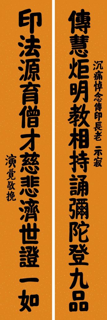 本寺退居东林堂上传沩仰正宗第九世上传下印长老,应化因缘了毕,一期功德圆成,于西纪二Ο二三年岁次癸卯二月十九日廿三时十六分安详示寂,舍报西归,群生顿失依怙,法海痛失津梁,天地同众心而垂泪,草木悯众情而含悲。
