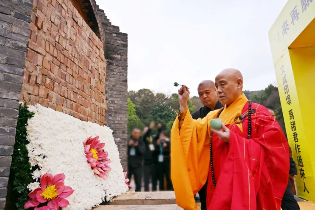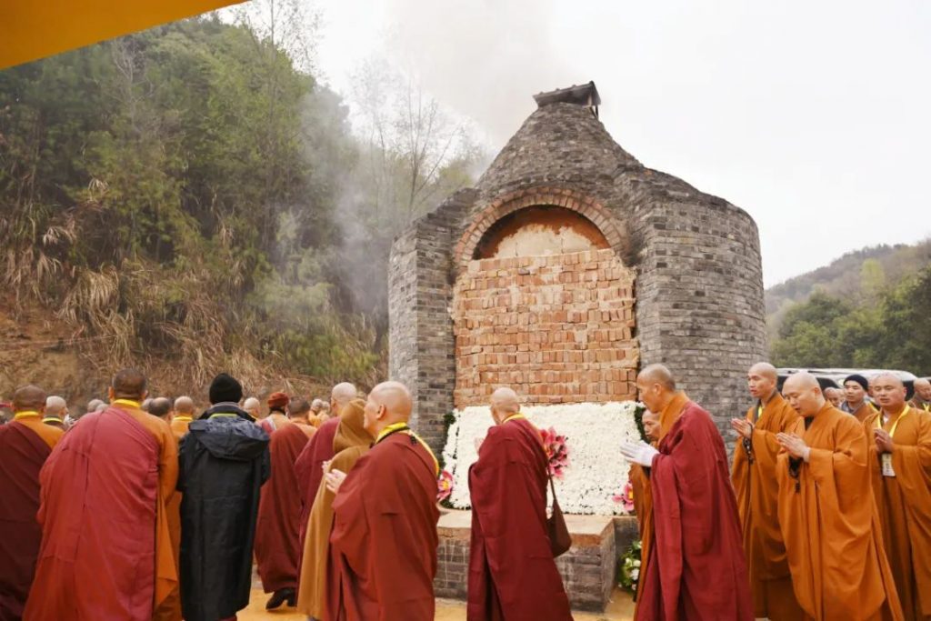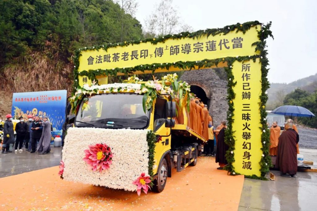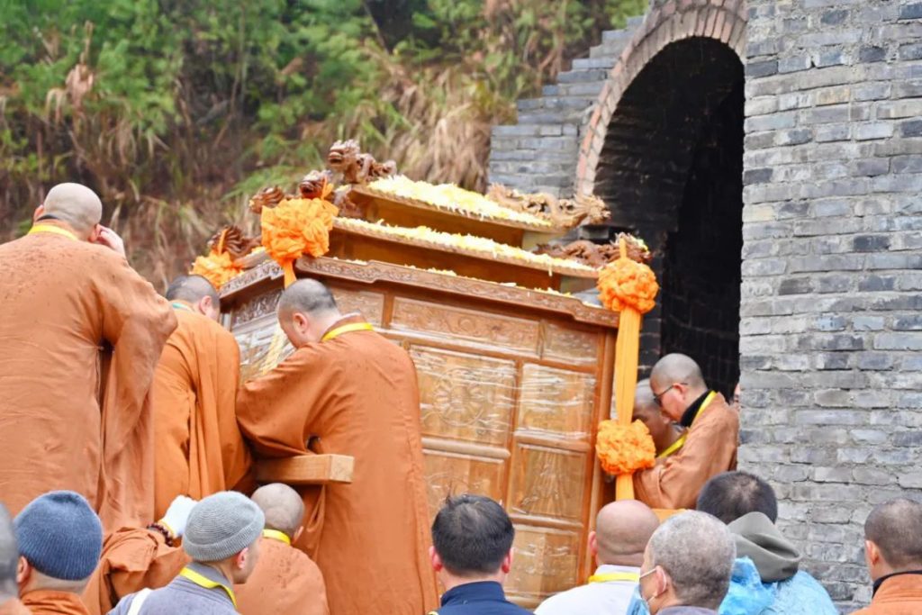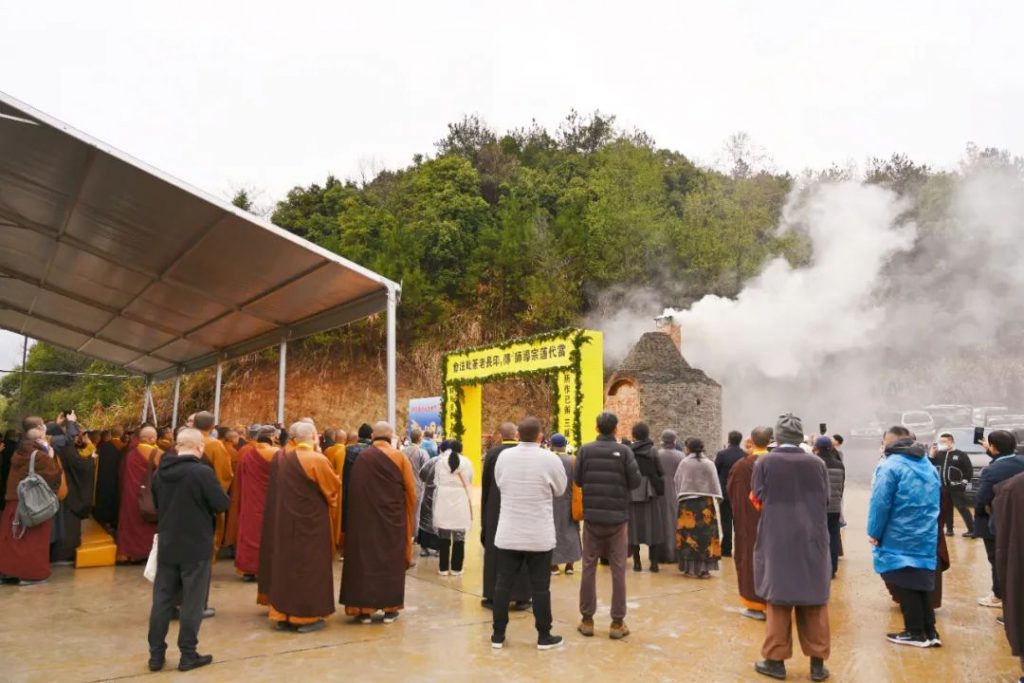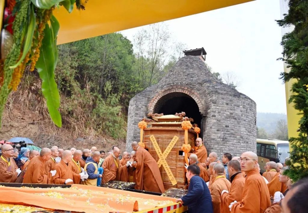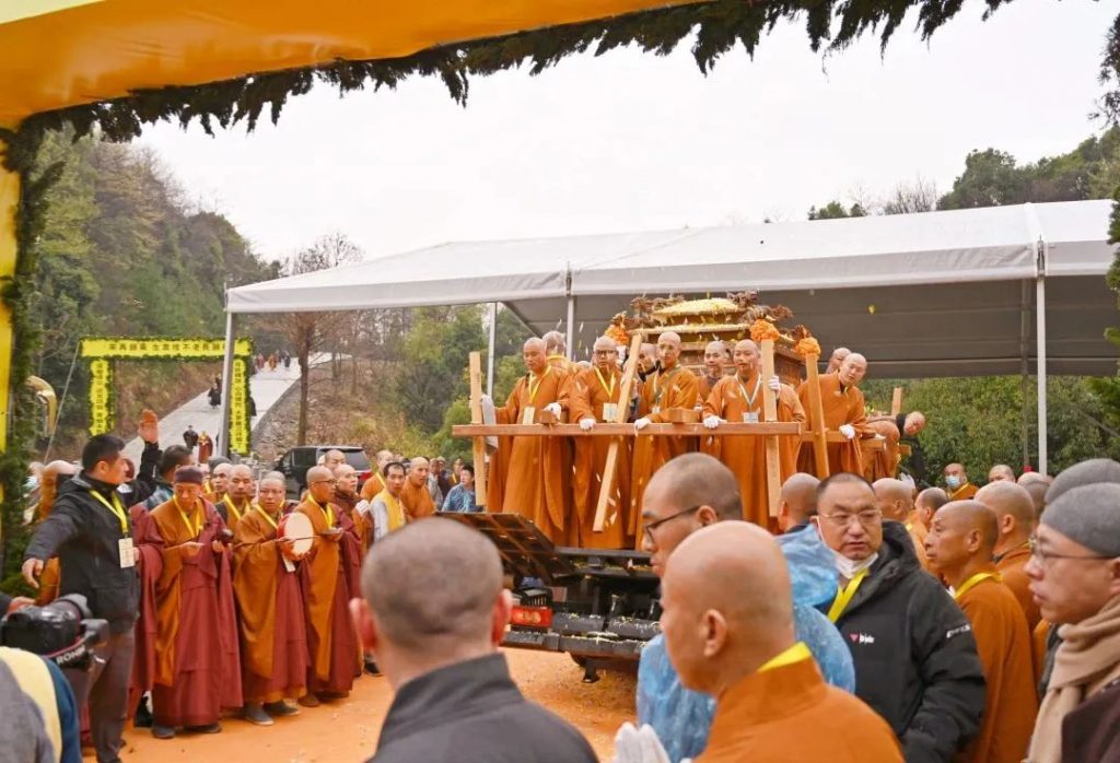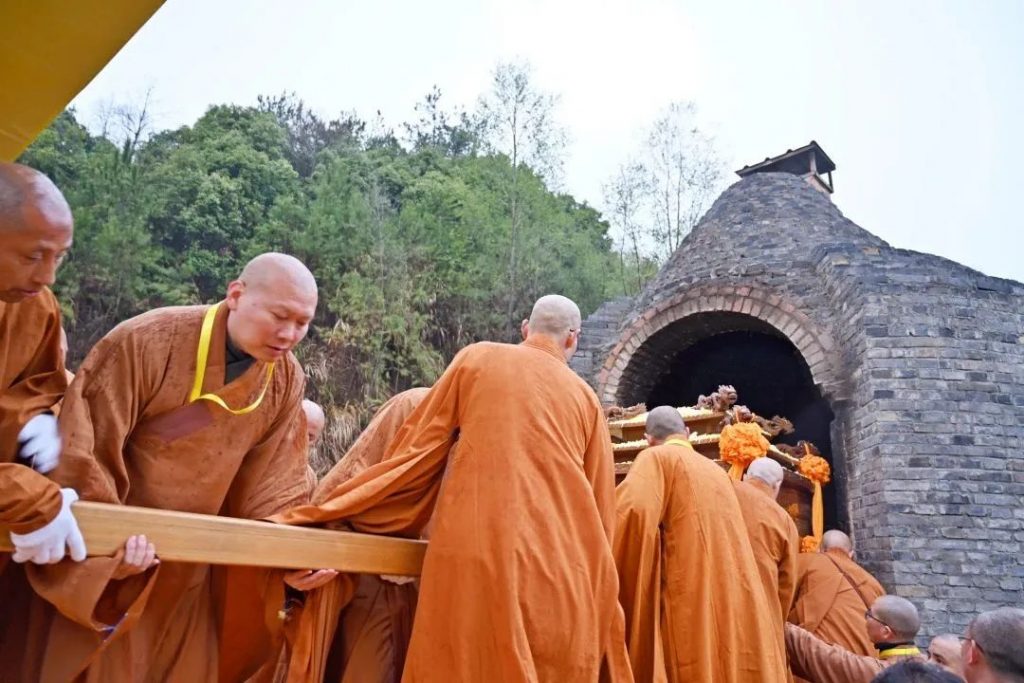 2023年3月17日7时,中国佛教协会名誉会长、庐山东林寺法主和尚上传下印长老灵龛在东林寺净土苑如法起龛,由仪仗队护行至净土苑化身窑荼毗现场。