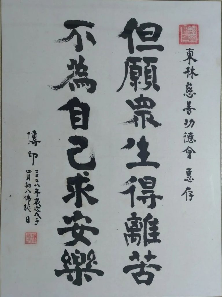 2008年,传印长老向东林寺慈善护生会题赠“不为自己求安乐,但愿众生得离苦”墨宝。从此,慈护会在大安法师的带领下,牢记长老的嘱托,积极响应国家的号召,将佛教的慈悲大爱从寺院融入到社会,扶贫济困,千里驰援,践行并诠释了佛教慈善的社会责任和使命担当!长老的谆谆教诲犹如指路明灯,激励着一代又一代东林慈善人不忘初心,砥砺前行!